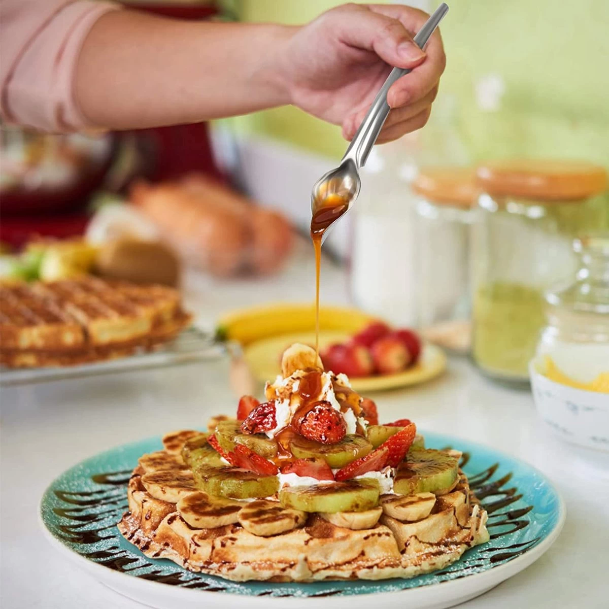 - Cuillère à long manche : la cuillère à crayons de décoration Chef a un bec en forme de cône et la bouche étroite peut empêcher de verser trop d’épices. Peut être utilisé avec du sirop, de la sauce, du caramel, du chocolat, de la vinaigrette, etc. Style pour dessiner avec précision.