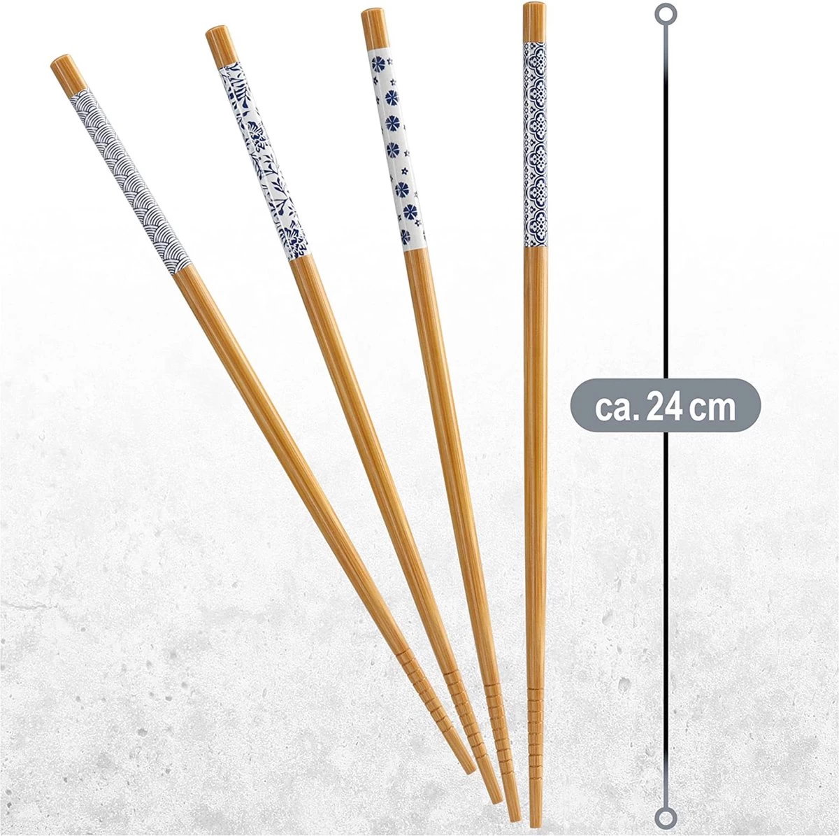 - CONTENU DE LA LIVRAISON : 12 paires de baguettes // Matériau : bambou // Dimensions : environ 24 x 0/ 0 cm (longueur x diamètre bas/haut) // Couleur : marron clair, bleu, blanc
