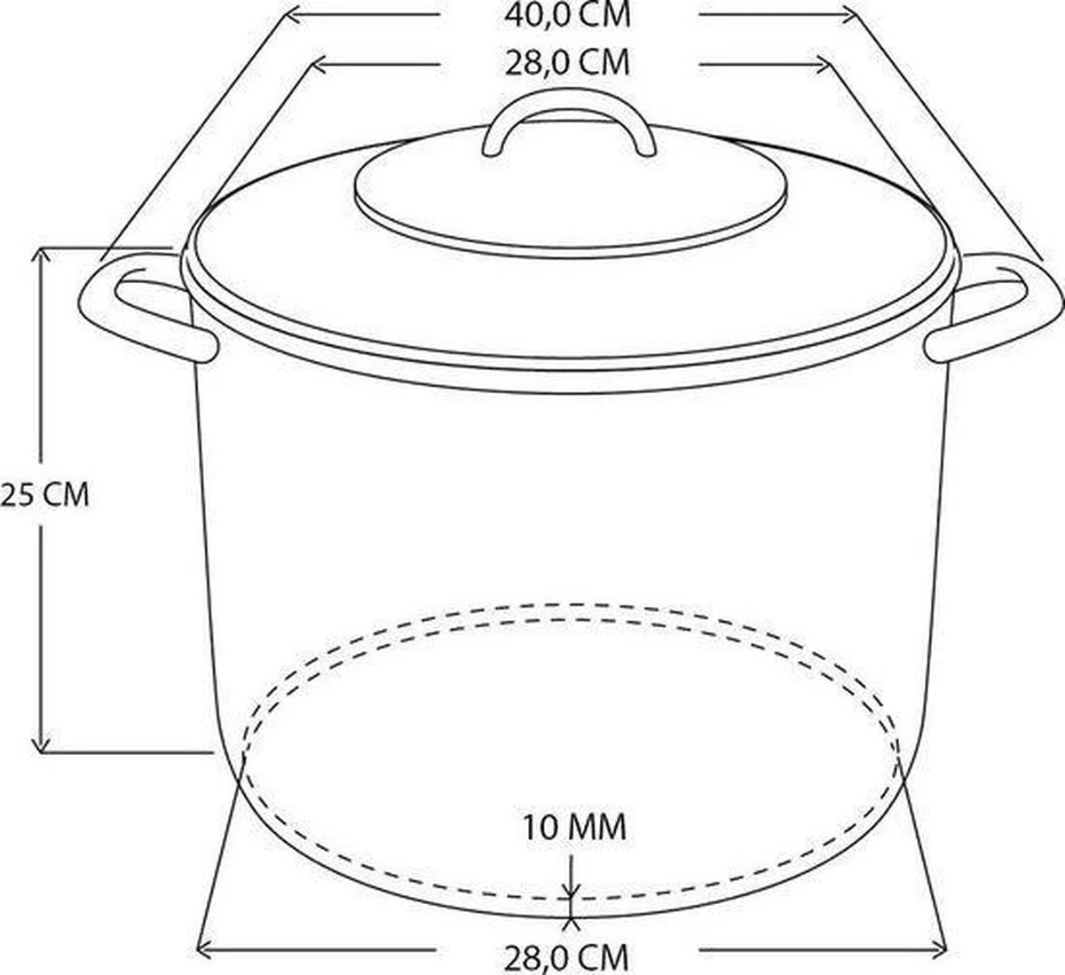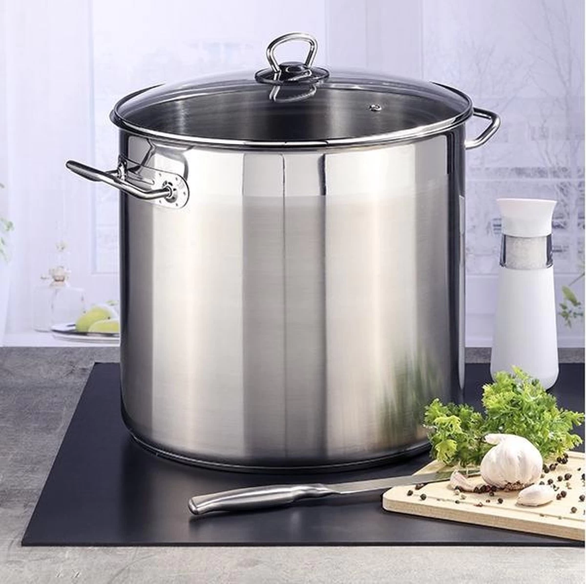 1x marmite / casseroles en acier inoxydable 15 litres avec couvercle. Cette casserole en acier inoxydable avec couvercle et poignées en verre a une taille d’environ 28 cm de diamètre et environ 25 cm de hauteur. Capacité : 15 litres. Le couvercle transparent est pourvu d’un trou d’aération à travers lequel la vapeur peut s’échapper. Convient aux sources de chaleur suivantes: céramique, électrique, halogène, induction et gaz. La marmite va au lave-vaisselle. Matériau : acier inoxydable. Casseroles ustensiles de cuisine / articles de cuisine.