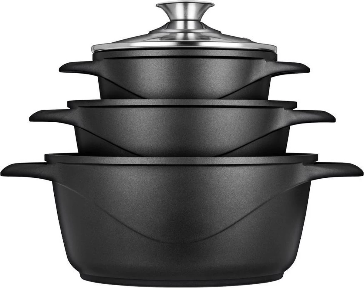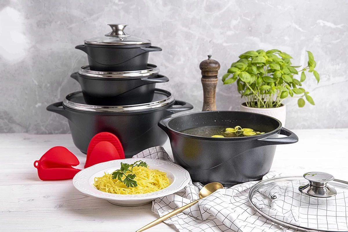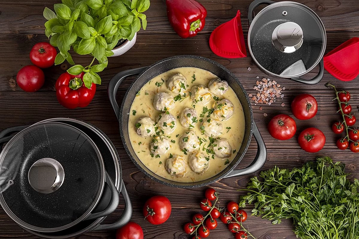 Ce magnifique ensemble de batterie de cuisine de la marque Smile donne à chaque cuisine une mise à niveau. Les casseroles conviennent à toutes les plaques de cuisson, y compris à induction, à gaz et électriques. Ainsi, même lorsque vous changez de maison ou de cuisine, vous pouvez continuer à utiliser ces casseroles. Le matériau noir et les couvercles en verre offrent un look luxueux et élégant, quelle que soit la couleur de votre cuisine. En plus de la belle apparence, les casseroles sont également de qualité supérieure; ils ont tous un revêtement antiadhésif, des boutons en acier inoxydable et des parois épaisses pour une répartition uniforme de la chaleur. L’ensemble de casseroles parfait pour la cuisson, la friture, le ragoût ou le rôtissage.