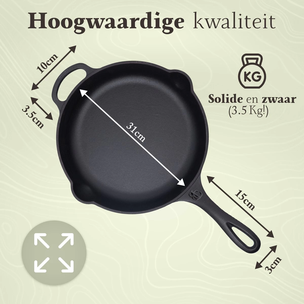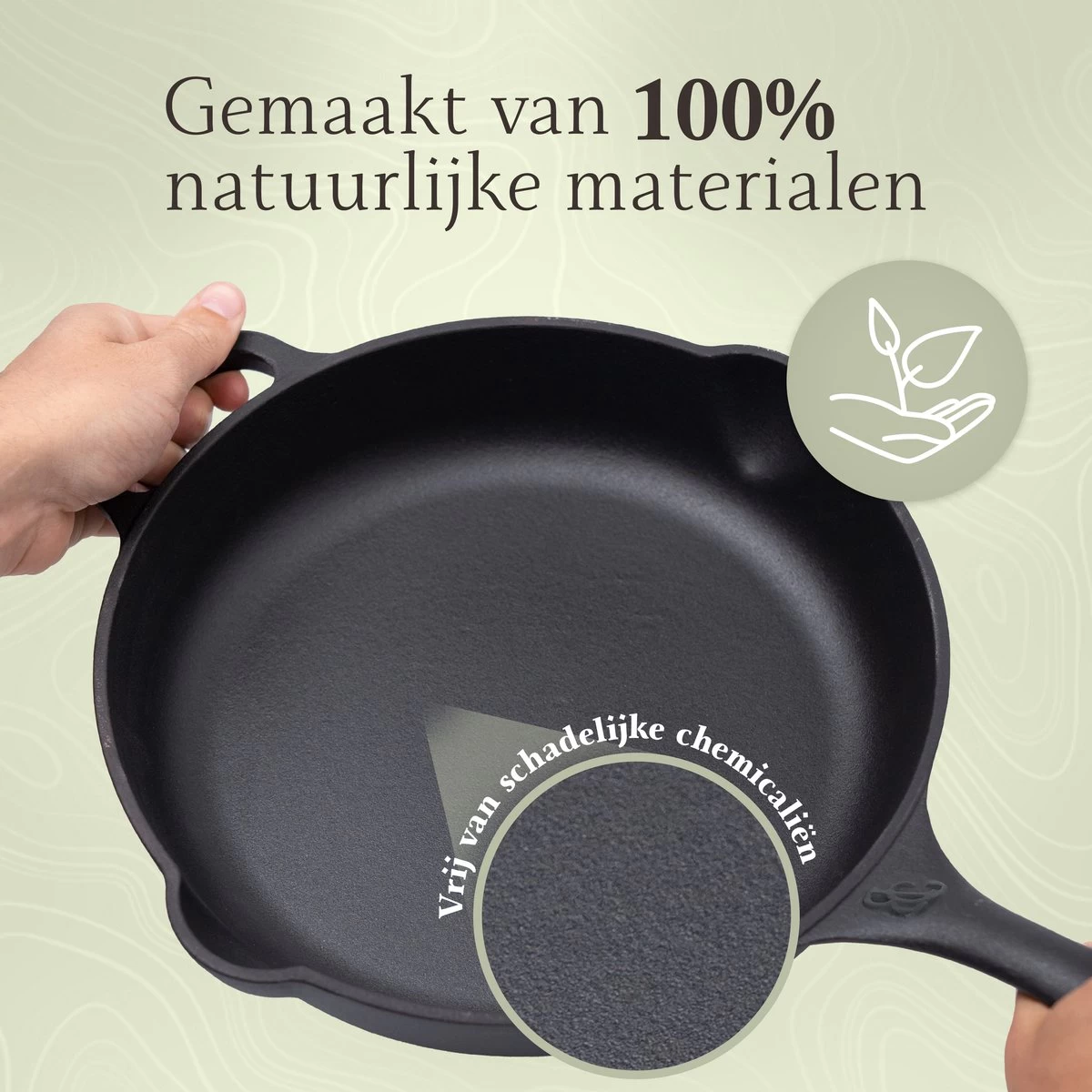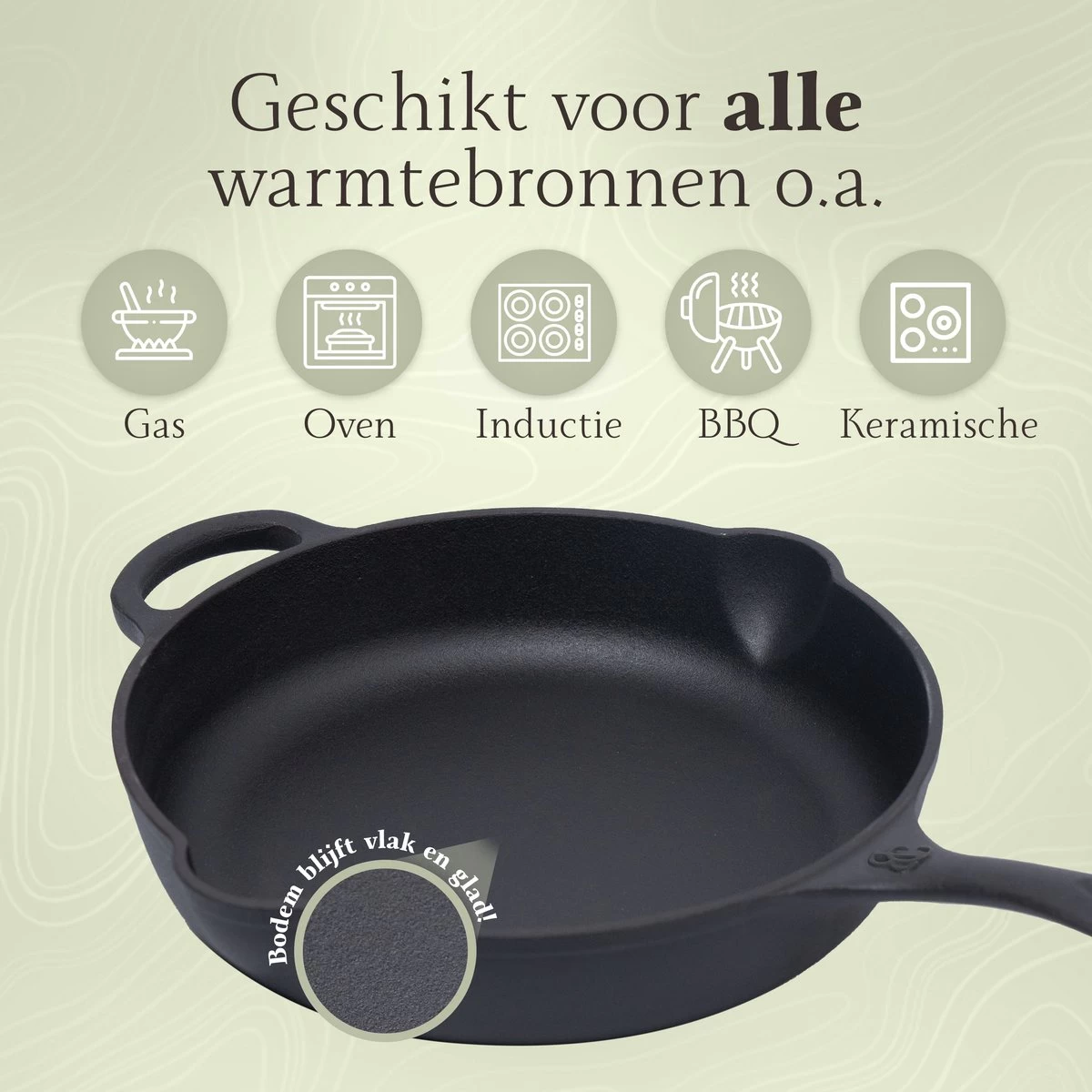 Notre poêle convient à tous les types de sources de chaleur , y compris le barbecue et l’induction. De plus, la poêle en fonte est composée de matériaux 100% naturels. L’avantage de ceci est que celapas de revêtement anti-adhésif a et doncpas de produits chimiques nocifs contient qui affectent votre santé. La couche d’émail dans notre casserole empêche vos aliments de coller. Perfect pour vos talents de cuisinier !
