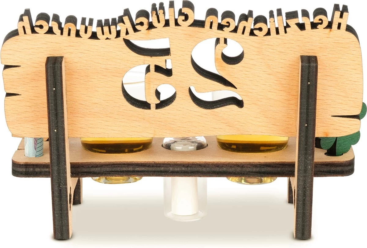 Banc à schnaps en bois de hêtre huilé – fabriqué par nos soins en Allemagne + 2 verres à schnaps de qualité gastronomique de la marque Arcoroc fabriqués en France + un trèfle vert + 2 numéros d’année correspondants + et une bouteille en verre avec bouchon de liège pour la décoration. La tirelire est livrée avec deux verres à liqueur en verre véritable. Ceux-ci conviennent au nettoyage au lave-vaisselle.