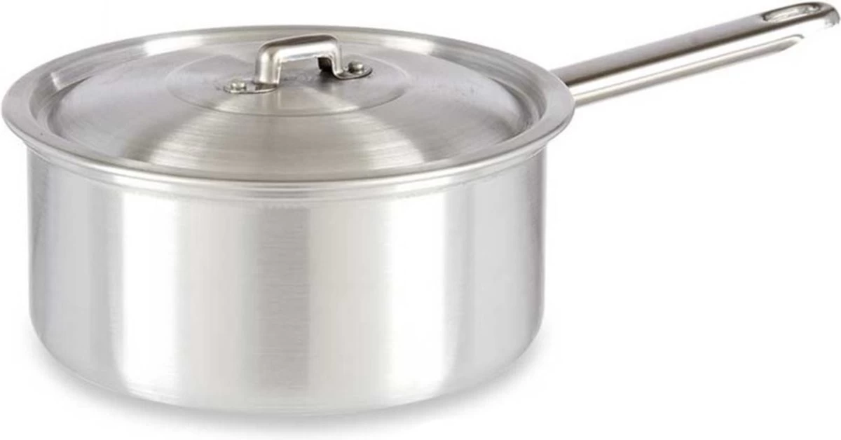 Casserole/saucière/saucière couleur argent 35 x 20 x 12 cm en aluminium de 2 litres. La casserole a un diamètre de 18 cm au sommet. Cette casserole a un couvercle. Convient pour le gaz, y compris le four, pas l’induction. Sans PFOA. Convient au lave-vaisselle: oui. Épaisseur 0,7 mm.