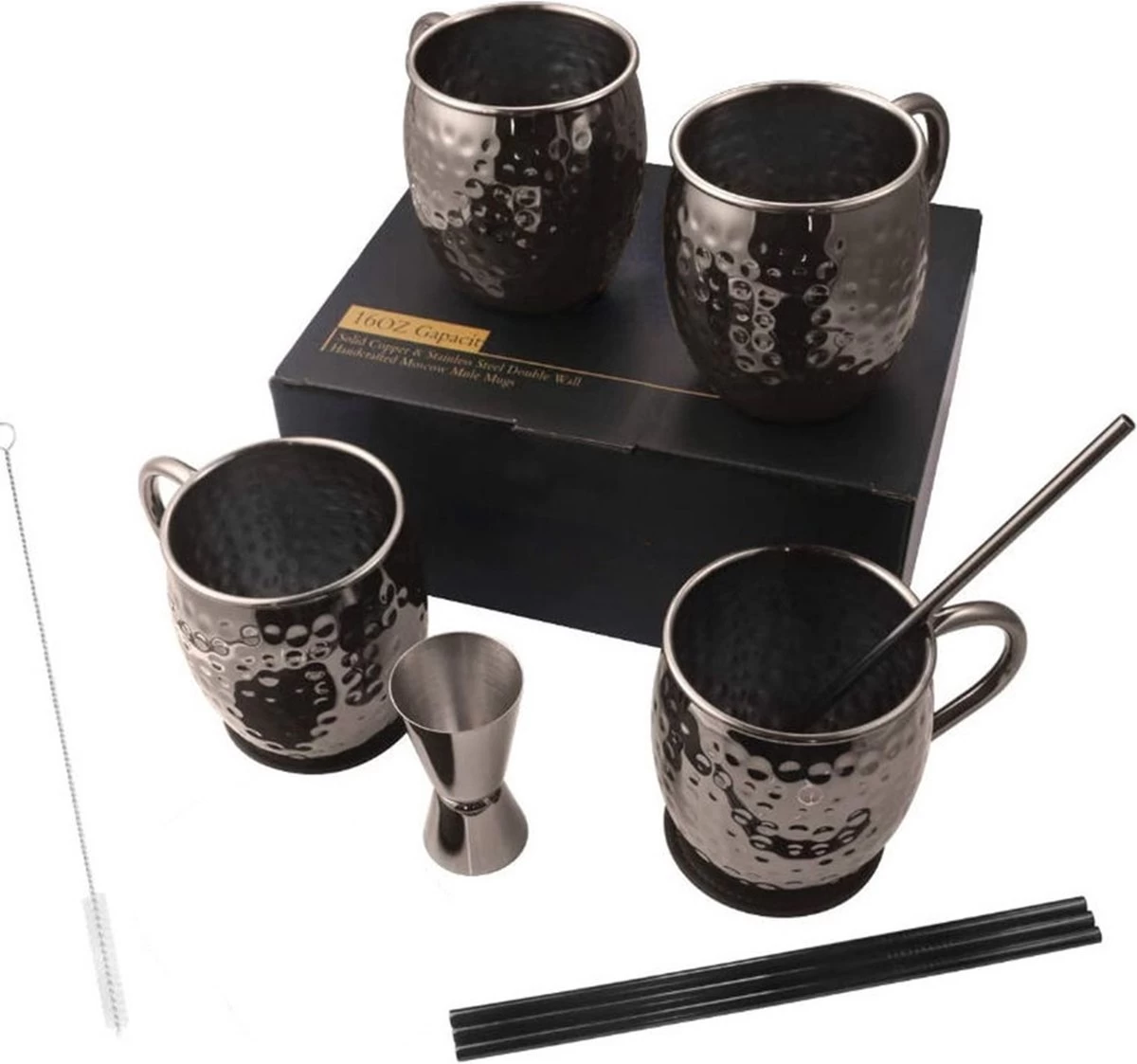 Le nouvel ensemble à cocktail de luxe Moscow Mule de Chefs Cuisine est entièrement fabriqué en acier inoxydable de haute qualité avec un revêtement en cuivre poli de couleur noire.