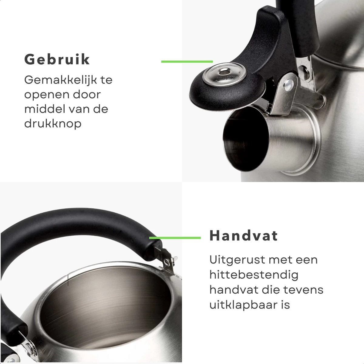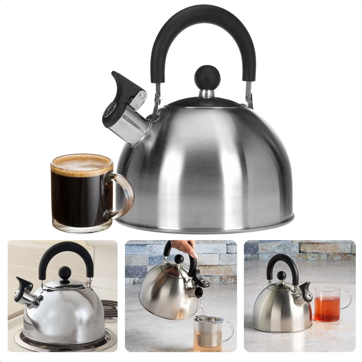 Avec cette bouilloire sifflante en acier inoxydable, vous pouvez facilement et rapidement chauffer de l’eau pour une délicieuse tasse de thé ou une autre boisson chaude. La bouilloire mesure 19 cm de diamètre et 12 cm de haut, ce qui la rend facile à installer sur n’importe quel réchaud. Il pèse 380 grammes, ce qui signifie qu’il est suffisamment léger pour être transporté si vous souhaitez le déplacer. La capacité de la bouilloire est de 2500 ml, ce qui offre plus qu’assez d’espace pour 4 à 6 tasses de thé ou d’autres boissons chaudes. La bouilloire sifflante convient au gaz, à l’électricité et à la céramique/halogène pour que vous ayez toujours de l’eau chaude où que vous soyez ! Avec cette belle bouilloire, vous pourrez facilement préparer une bonne théière ou d’autres boissons chaudes ! Vous n’avez jamais besoin d’attendre longtemps pour que l’eau se réchauffe à nouveau ; grâce aux fonctions utiles qui y sont intégrées, c’est beaucoup plus rapide que la normale !