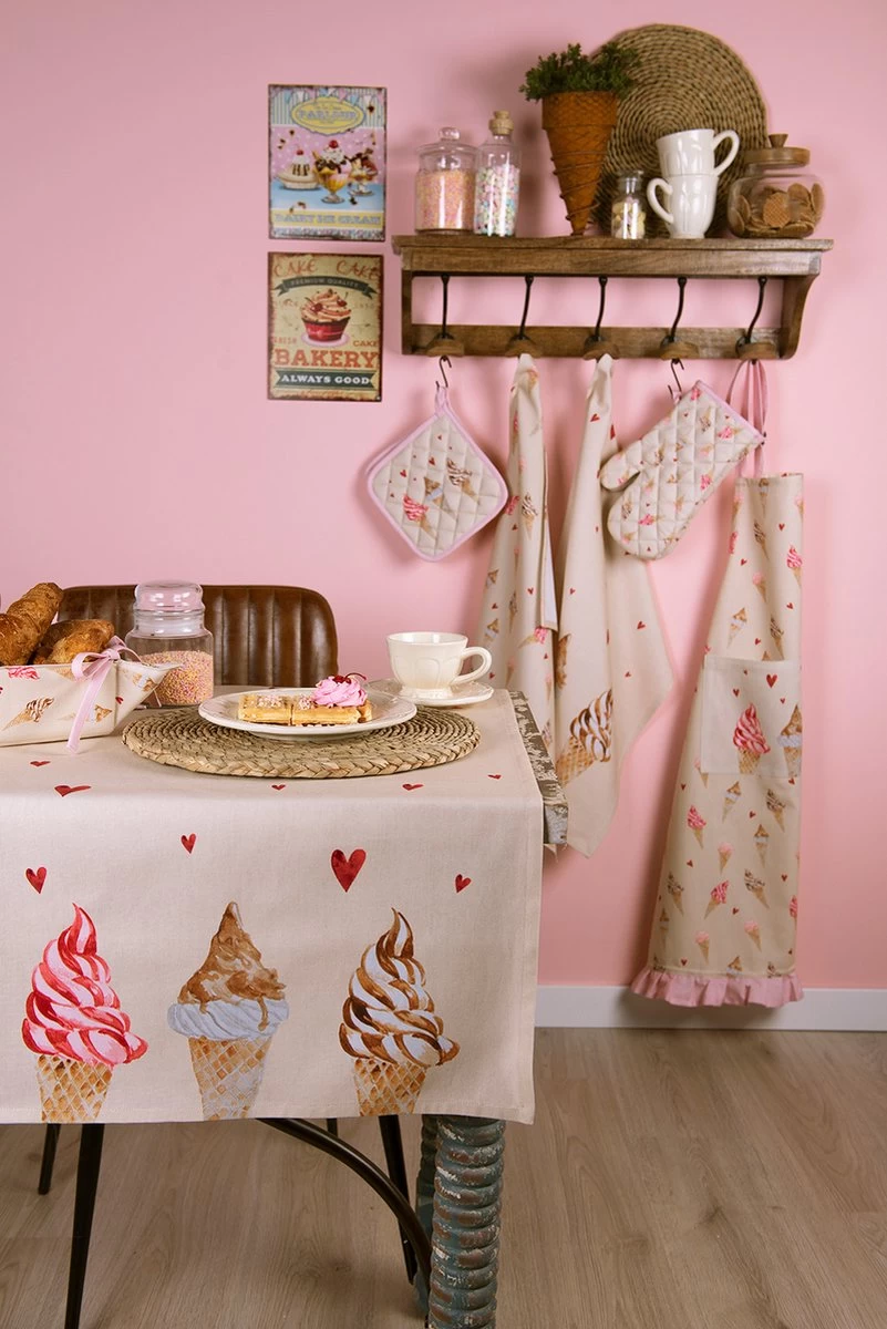 Plus doux que doux ! Une série gaie et mignonne avec un motif de glaces et de coeurs rouges. Les ingrédients parfaits qui rendent cette collection si mignonne. Les accents roses et le fond blanc cassé sont la base parfaite pour les belles illustrations. Rendez les moments de table encore plus festifs avec ces chemins de table, torchons de cuisine, gants de cuisine, maniques et corbeilles à pain. Il y a même une collection pour enfants disponible à partir de cette collection. La crème glacée est toujours une bonne idée !
