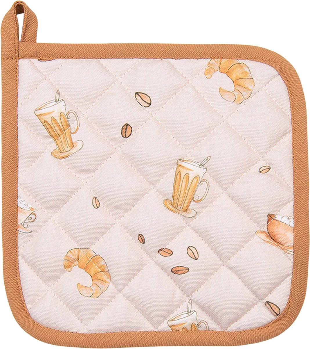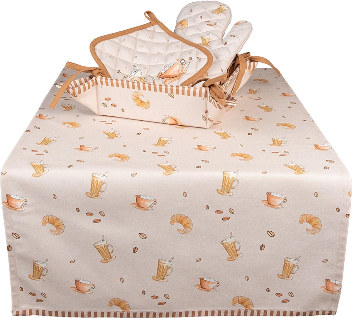 Cette série textile est un complément parfait à un dimanche matin parfait. Amusez-vous à préparer et à manger votre petit-déjeuner préféré avec une délicieuse tasse de café… une journée ne pouvait tout simplement pas mieux commencer. Cette collection présente des motifs avec des croissants, des tasses de café et des grains de café sur un fond beige calme. Le motif de diamant contemporain complète cette série. Couvrez la table avec un chemin de table avec une corbeille à pain assortie, ou faites cuire avec le tablier de cuisine, les maniques et les gants de cuisine assortis. Avec cette collection, vous pouvez profiter de votre petit-déjeuner préféré tous les jours.