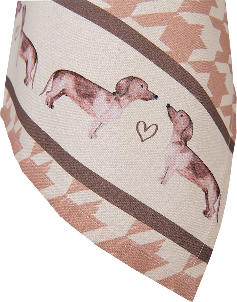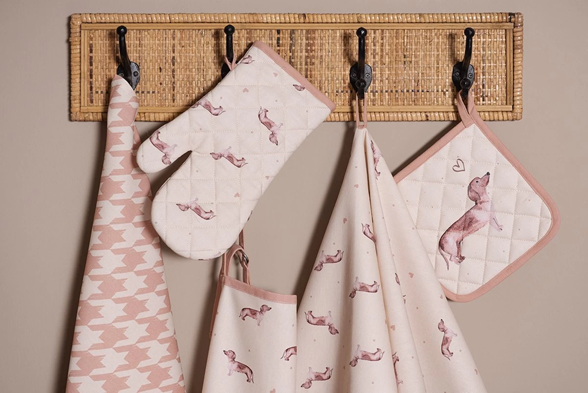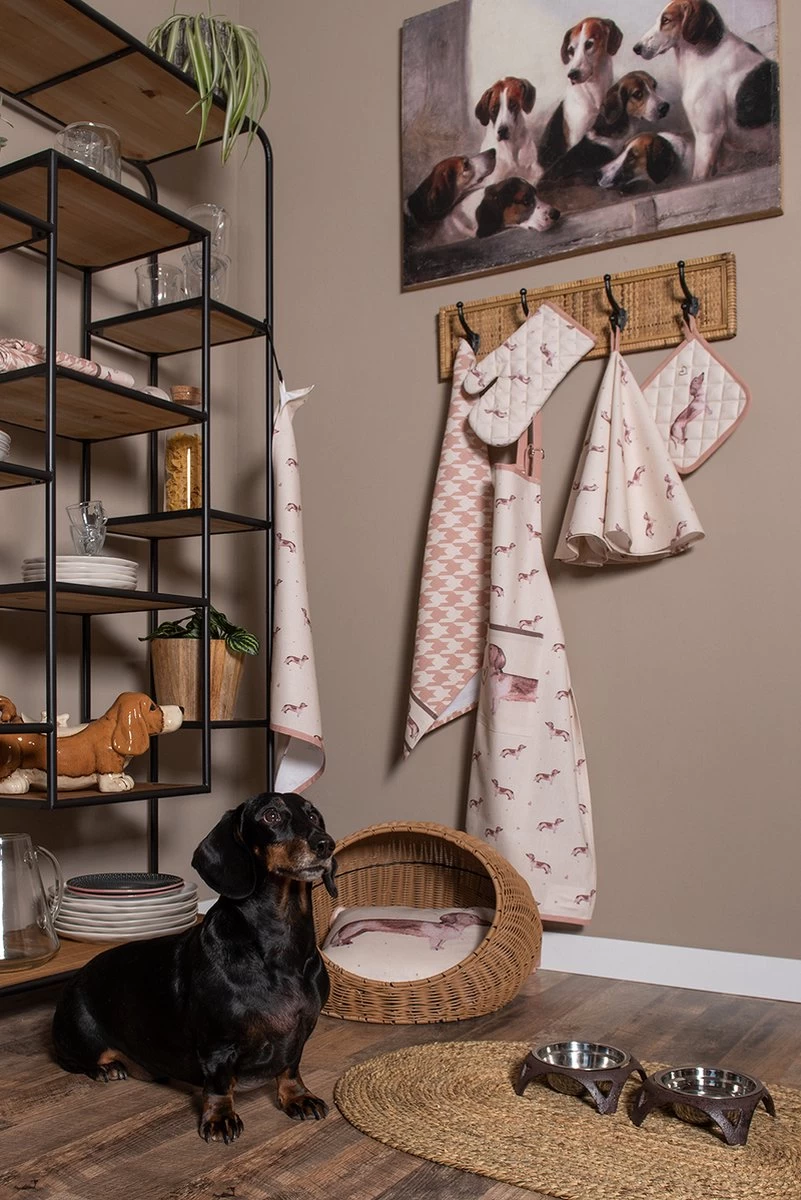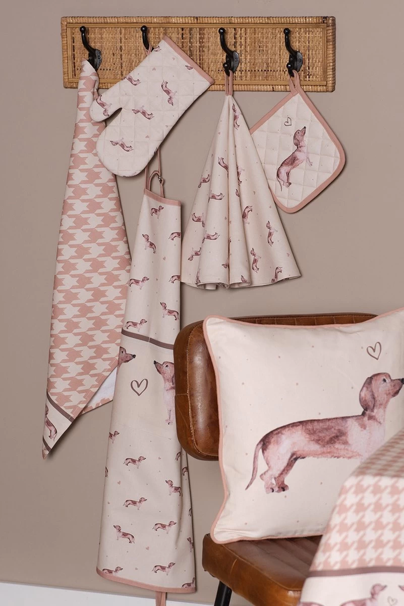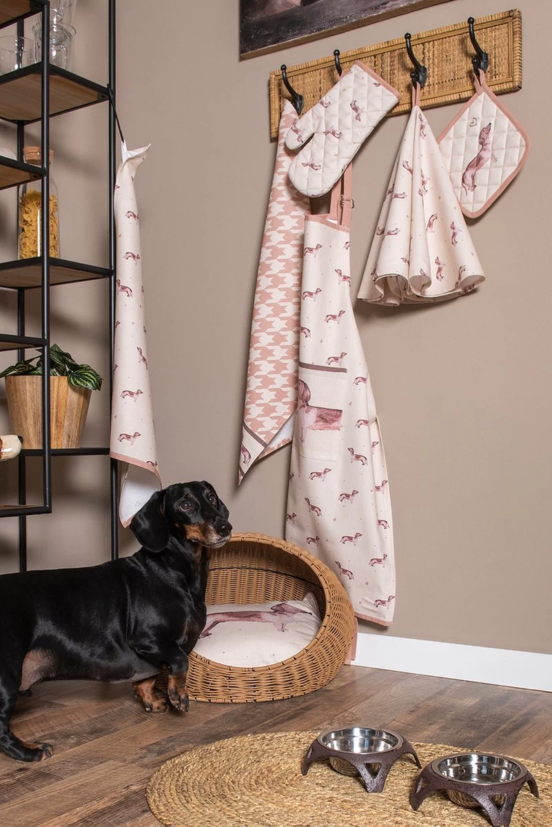 Qui n’aime pas les teckels ! Cette race joyeuse mais têtue est au cœur de cette collection textile. Les beaux accents bruns et les motifs gais font battre plus vite le cœur de tous les amoureux des chiens. Le gant de four, la manique et le tablier de four sont disponibles pour les adultes et les enfants. Les coussins décoratifs donnent une atmosphère supplémentaire et transforment n’importe quelle pièce en un espace confortable. Les corbeilles à pain en tissu, les torchons, les nappes et les chemins de table sont tous joliment conçus et forment un bel ensemble à table et dans la cuisine.