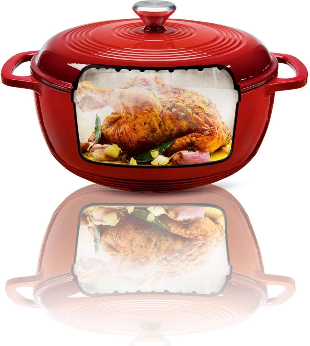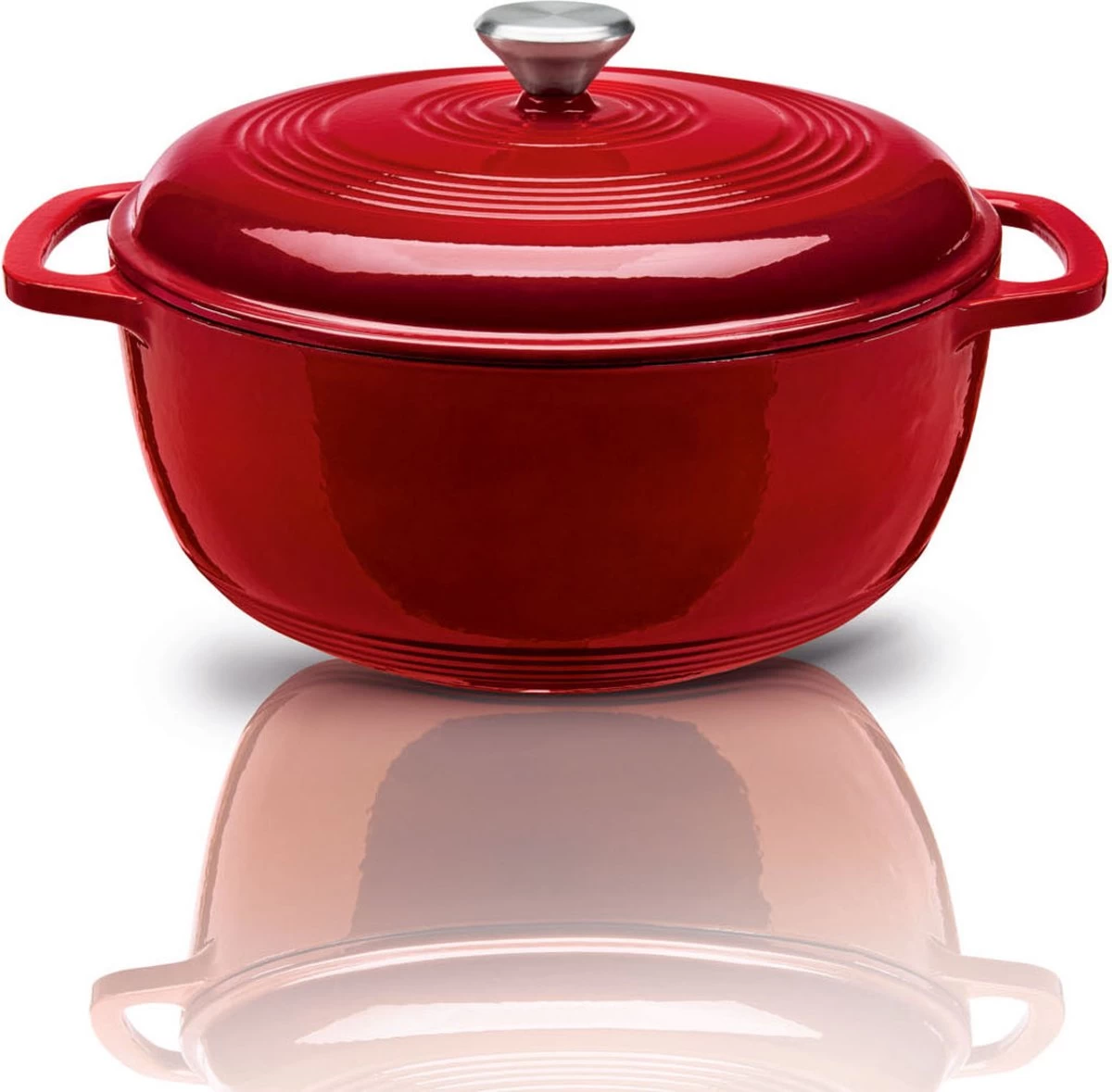 - Cette cocotte en fonte a une capacité de 5,7 litres, est recouverte d’un revêtement en émail rouge et est économe en énergie grâce à une répartition uniforme et rapide de la chaleur
