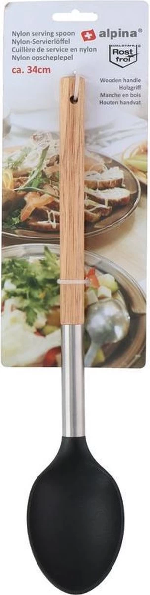 Une cuillère de service / cuillère à sauce, avec un oeil de suspension, en nylon, acier inoxydable et bambou. Longueur: environ 34 cm. La section de la cuillère est en nylon afin que votre casserole ne soit pas endommagée. Ne vont pas au lave-vaisselle. Ustensiles de cuisine servant des cuillères.
