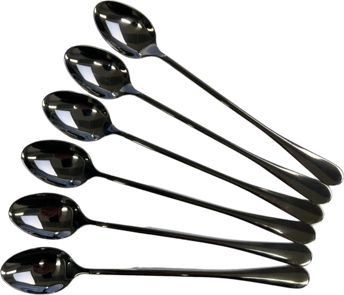 Set de 6 cuillères à Latte Macchiato en acier inoxydable noir. Pratique pour remuer dans des verres longs.