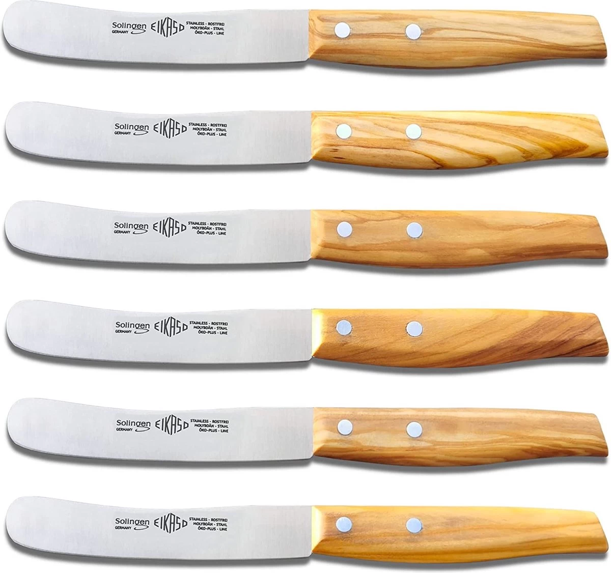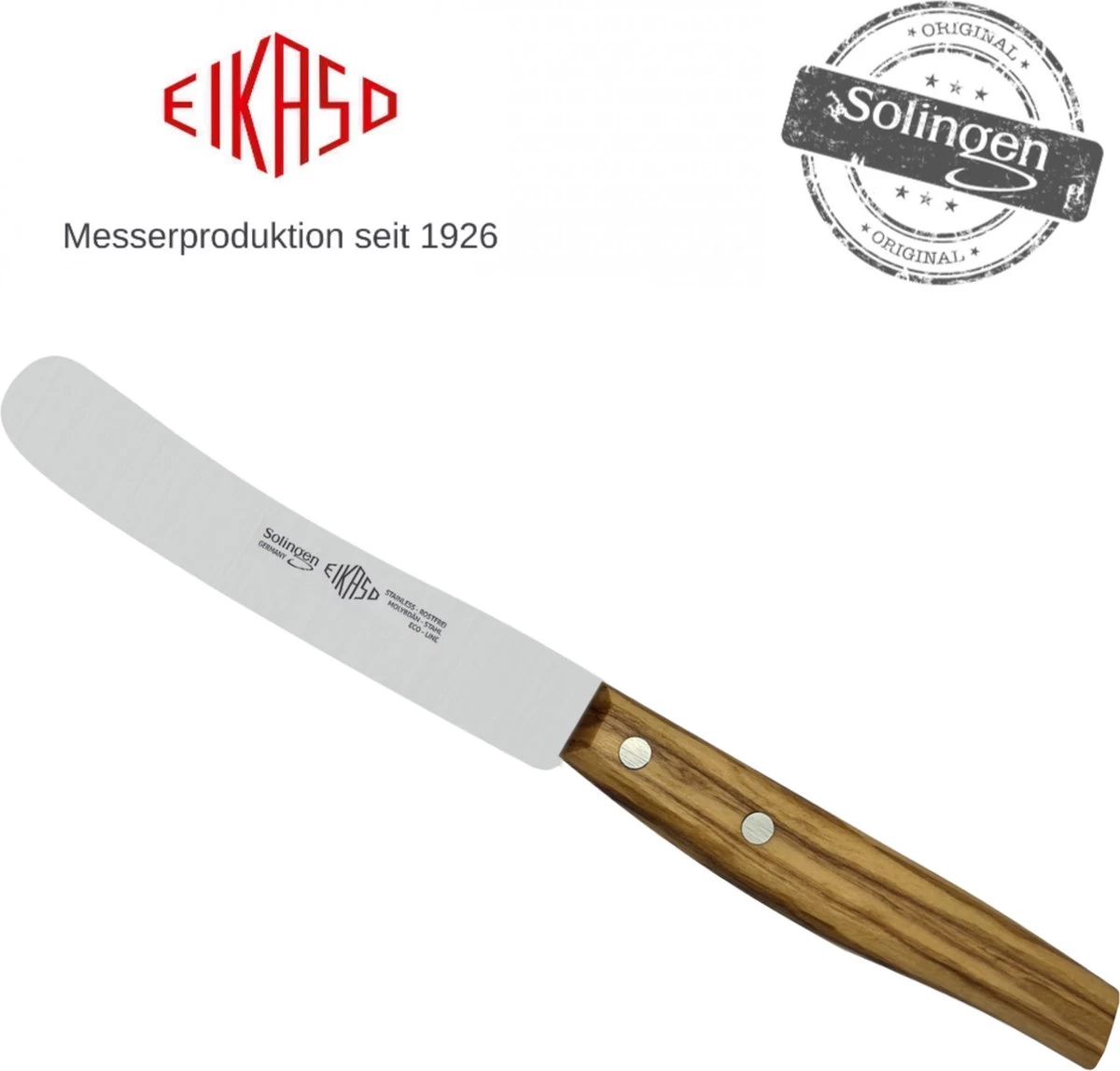 Ce couteau à petit-déjeuner d’Eikaso Solingen est idéal pour couper simplement du fromage, des saucisses, des légumes et des fruits, mais aussi parfaitement adapté pour le beurre. Ce couteau à petit-déjeuner est un outil utile pour couper des produits durs à l’extérieur et mous à l’intérieur. La lame a une longueur totale de 11 cm. La lame est en acier inoxydable et possède un manche en bois d’olivier.