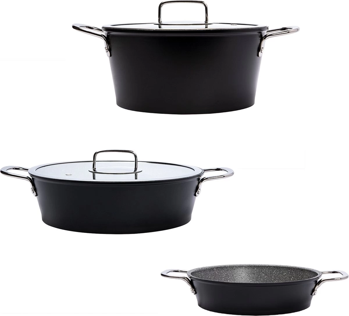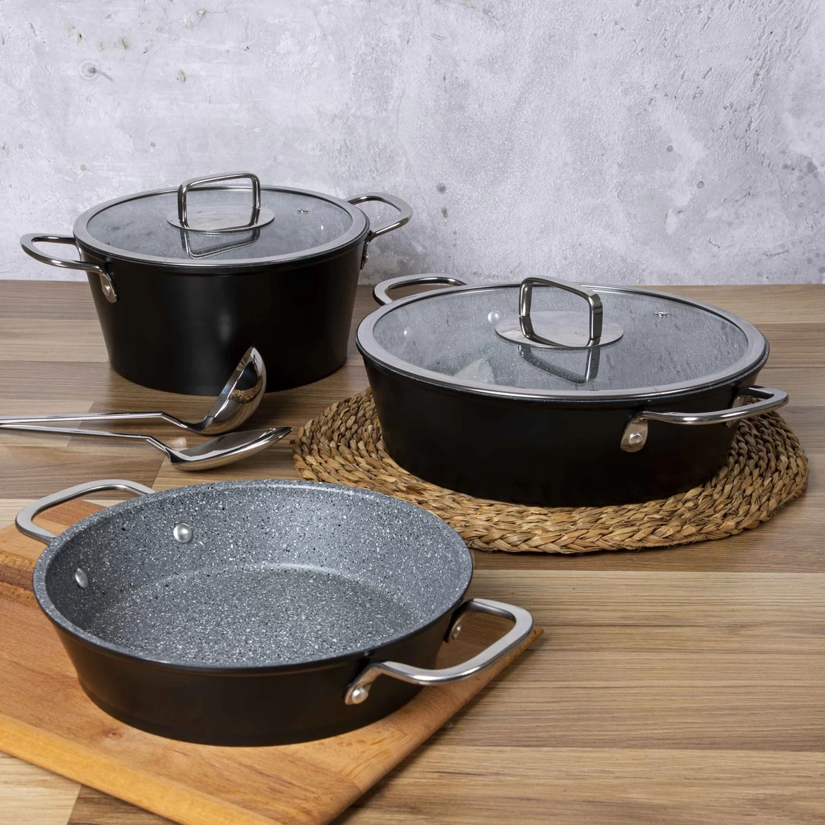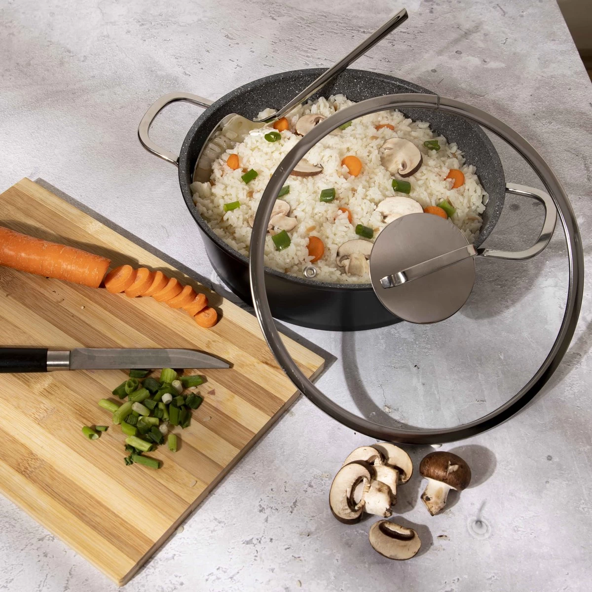 Les poêles universelles Serenk Excellence Collection se font un naam en tant que compagnon moderne dans la cuisine. Cette batterie de cuisine de haute qualité, durable et facile à utiliser fera passer votre expérience culinaire au niveau supérieur. Les poêles antiadhésives Serenk sont fabriquées en granit de haute qualité, qui est renforcé avec le matériau spécial PTFE pour être plus durable, fonctionnel et techniquement meilleur. C’est pourquoi les casseroles et poêles Serenk sont sûres, non toxiques, antiadhésives et durables. Cela crée une couche de saveur qui assure une forme élégante et un nettoyage facile.