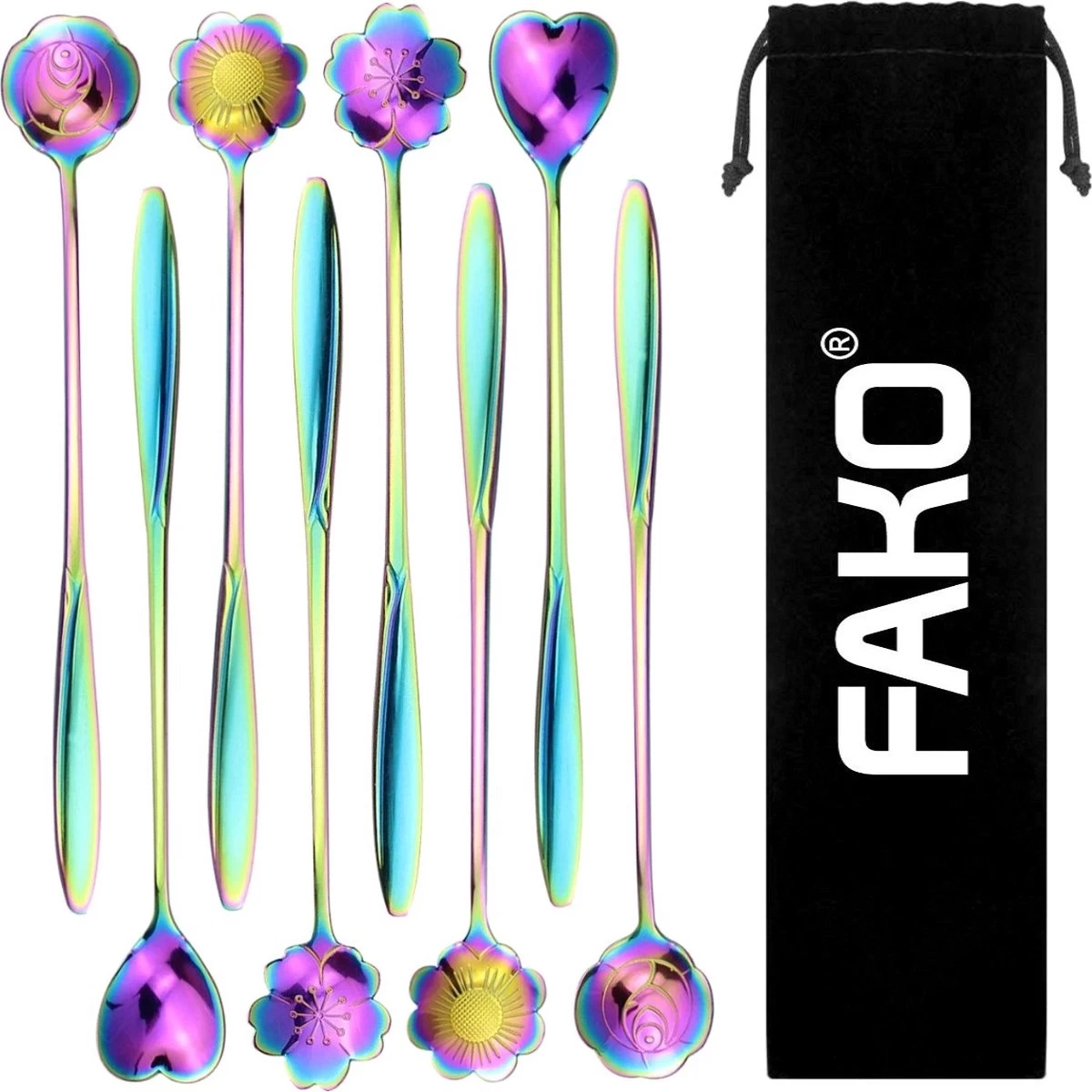 Un ensemble de 8 longues Cuillères à motif de Bloem en acier inoxydable de couleur arc-en-ciel de Fako Bijoux® à un prix compétitif. Ces cuillères mesurent plus de 17 cm de long et peuvent être utilisées comme cuillère à café longue, cuillère à dessert, cuillère à glace ou comme cuillère dans un délicieux cocktail. Le motif amusant assure un sourire sur le visage de tout le monde à table. Avec cette cuillère, vous atteignez toujours le fond du verre et vous n’avez pas à vous soucier que la cuillère se perde sous la mousse ou la glace. Vous recevrez quatre modèles différents et 2 pièces de chaque modèle. Livré dans un sac de rangement en velours.