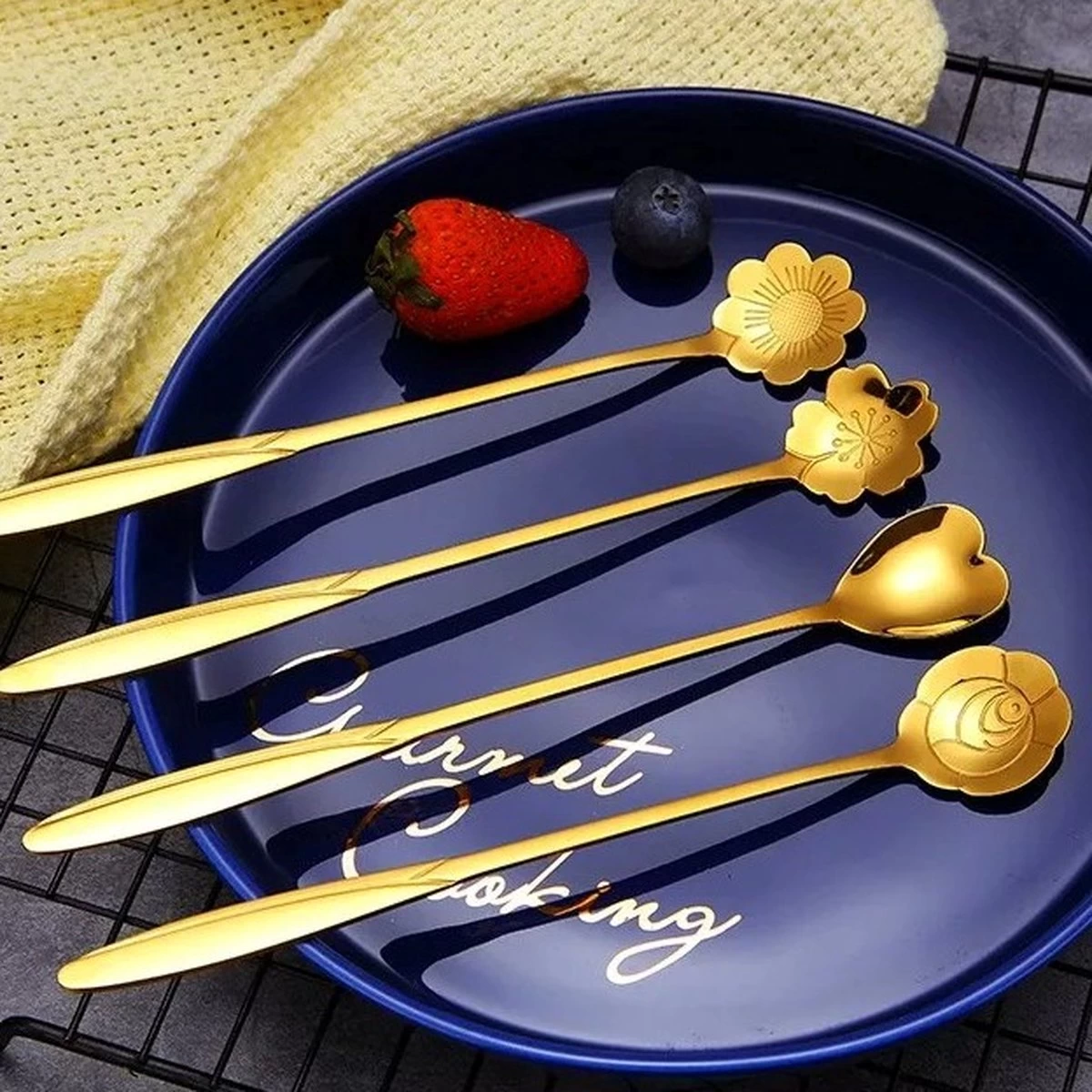 Un ensemble de 8 longues Cuillères à motif de Bloem en acier inoxydable doré de Fako Bijoux® à un prix compétitif. Ces cuillères mesurent plus de 17 cm de long et peuvent être utilisées comme cuillère à café longue, cuillère à dessert, cuillère à glace ou comme cuillère dans un délicieux cocktail. Le motif amusant assure un sourire sur le visage de tout le monde à table. Avec cette cuillère, vous atteignez toujours le fond du verre et vous n’avez pas à vous soucier que la cuillère se perde sous la mousse ou la glace. Vous recevrez quatre modèles différents et 2 pièces de chaque modèle. Livré dans un sac de rangement en velours.