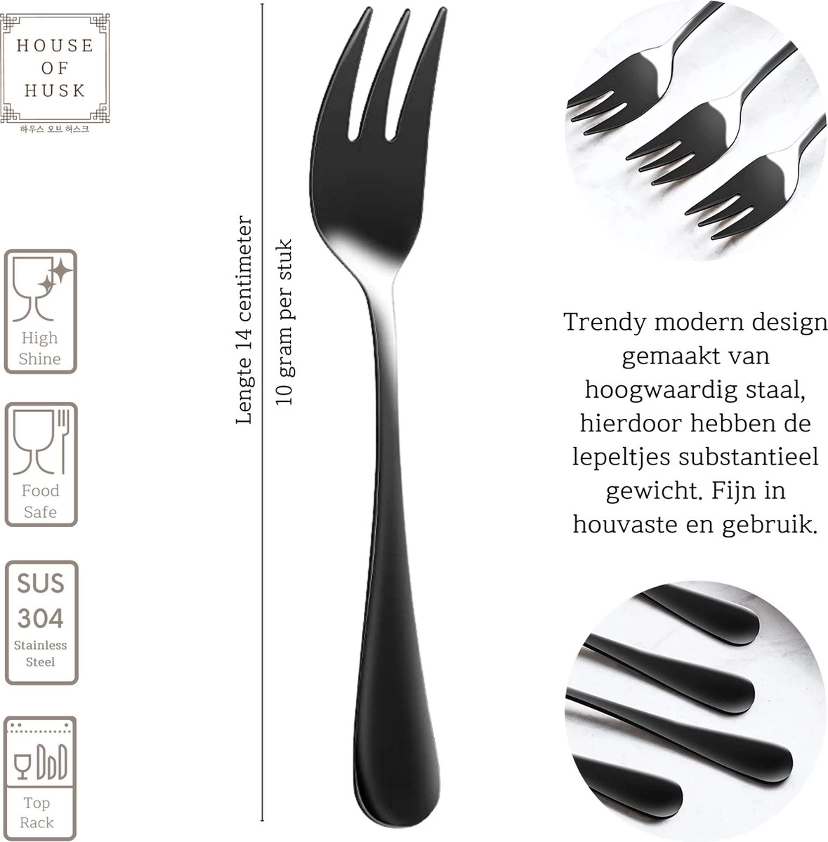 Nos fourchettes à dessert House of Husk ® sont très polyvalentes, ce qui les rend entièrement équipées. Par exemple, il peut être utilisé pour ; tarte, gâteau, fruits, mais aussi comme bâtonnet de cocktail sur, par exemple, un plateau de tapas et fromages. Avec cette belle fourchette à dessert en acier inoxydable noir au design élégant, vous pouvez transformer n’importe quelle table de collation ou pâtisserie en un moment culinaire luxueux.