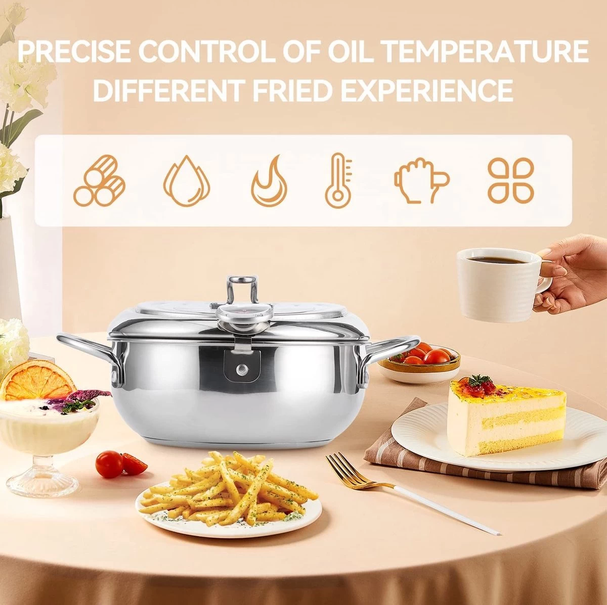 - CONCEPTION DU THERMOMÈTRE – Le thermomètre indépendant peut contrôler avec précision la température de l’huile. Vous pouvez vérifier la température de l’huile pendant l’utilisation. Lorsqu’il a atteint la bonne température, déposez les aliments pour les rendre plus délicieux. Rappel : Si vous faites cuire des aliments et qu’il y a des enfants ou des personnes âgées à côté de vous, veuillez vous éloigner pour ne pas les blesser.