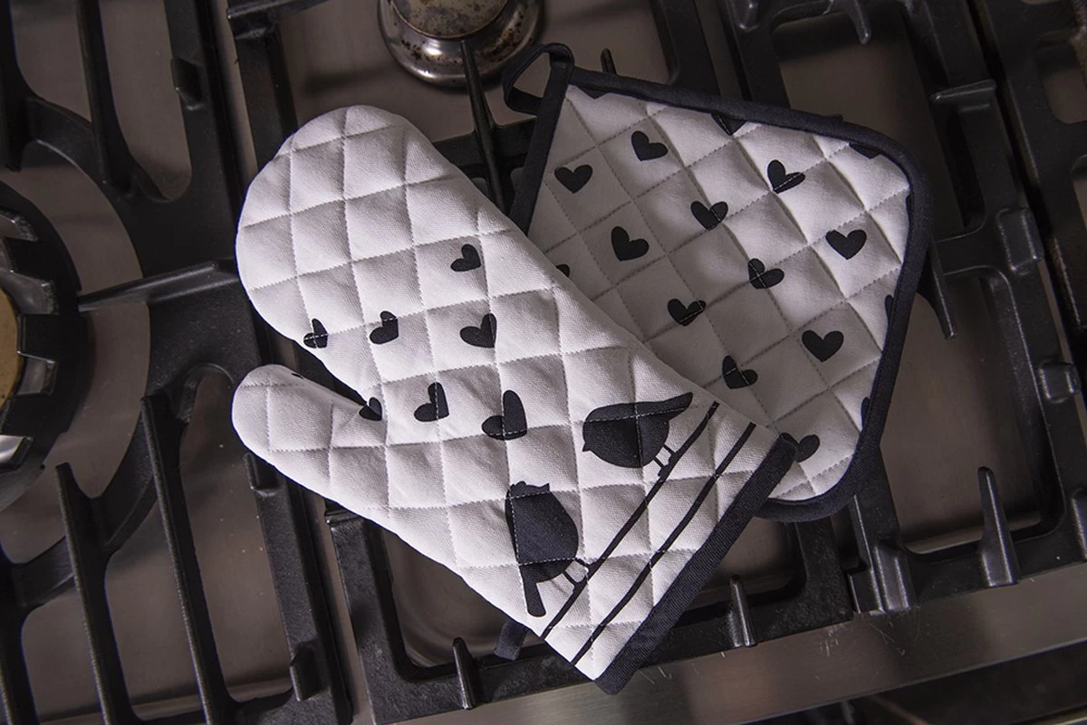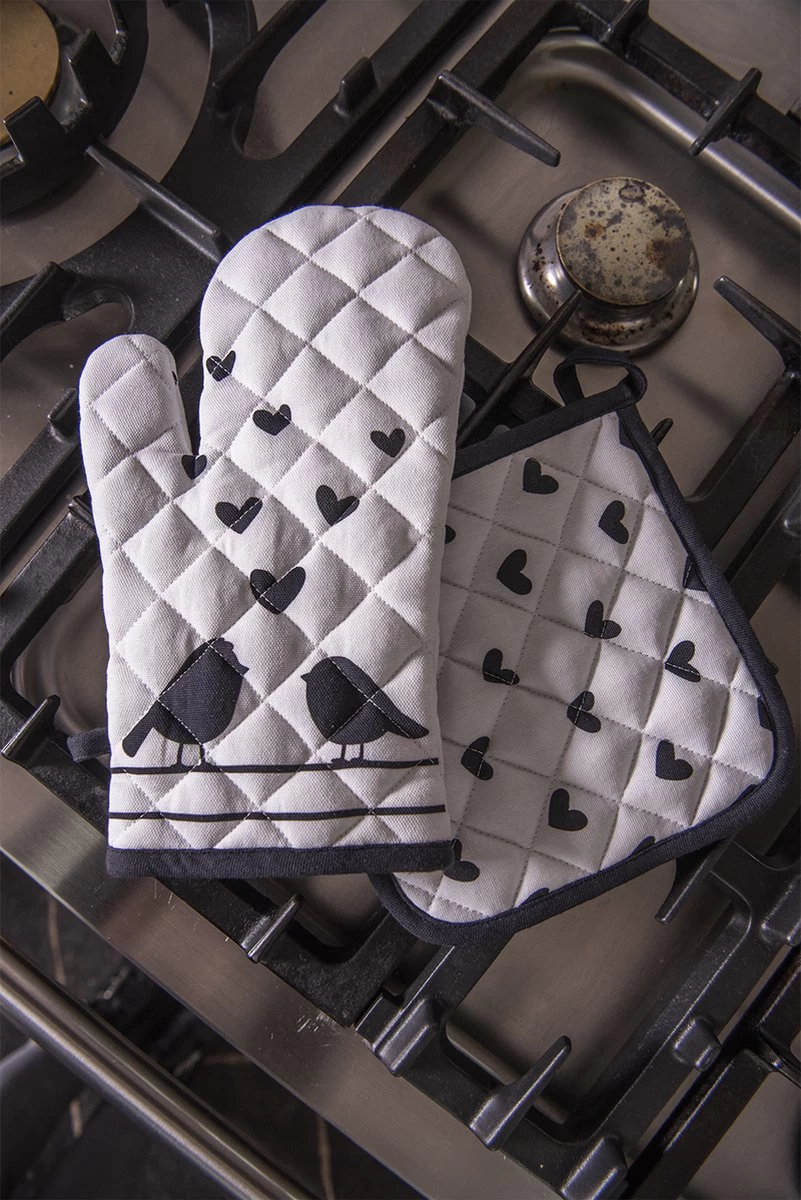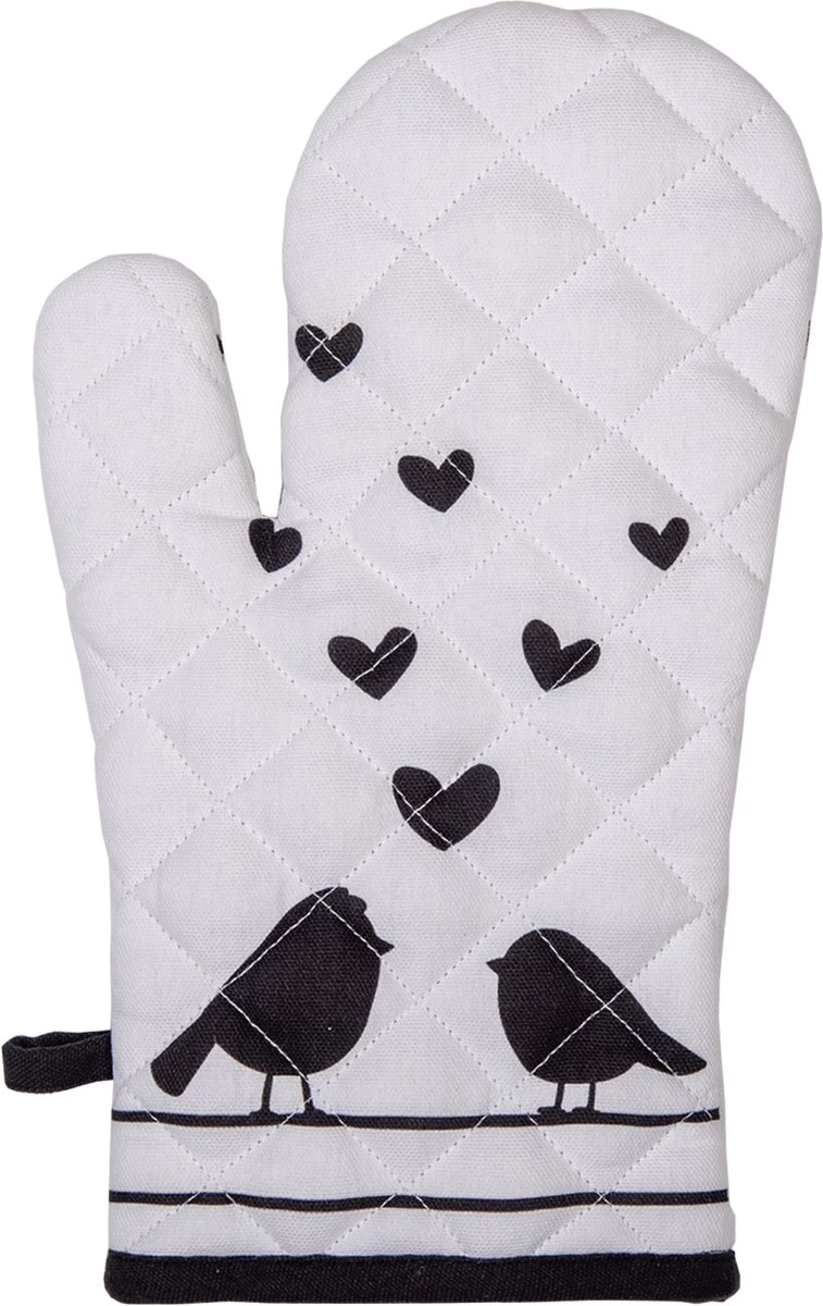 Cet élégant gant de cuisine de la marque Clayre & Eef avec motif oiseaux et cœurs sur fond noir/blanc est à la fois beau et pratique. L’imprimé champêtre au look romantique confère à votre cuisine une ambiance cosy et chaleureuse. Le gant de four est composé à 100 % de coton avec un rembourrage en polyester pour l’isolation et possède une boucle pratique pour accrocher le gant de four. La taille de la mitaine de four est de 16 * 30 cm, s’adapte bien autour de votre main et donne une bonne prise en main. A fière allure dans votre cuisine, s’intègre dans n’importe quel intérieur et vous aide à sortir facilement et en toute sécurité des plats chauds du four ou du micro-ondes. Nos gants de cuisine peuvent être lavés en machine à laver. Ces gants de cuisine proviennent de la série de textiles de cuisine Love Birds. Dans cette belle série, vous trouverez également des articles assortis tels que des nappes, des nappes, des chemins de table, des oreillers, des sets de table, des serviettes, des tabliers, mais aussi des torchons et des torchons, des maniques et des corbeilles à pain. Avec les textiles de cuisine de Clayre & Eef , votre cuisine sera encore plus cosy !