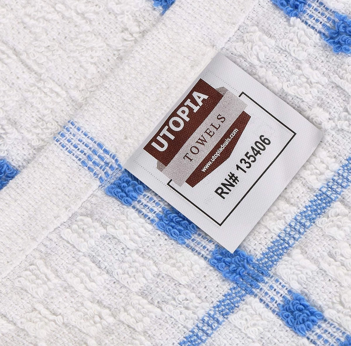 Set composé de 12 torchons en coton avec six torchons bleus et six torchons blancs en forme de dé mesurant 38 par 64 cm.