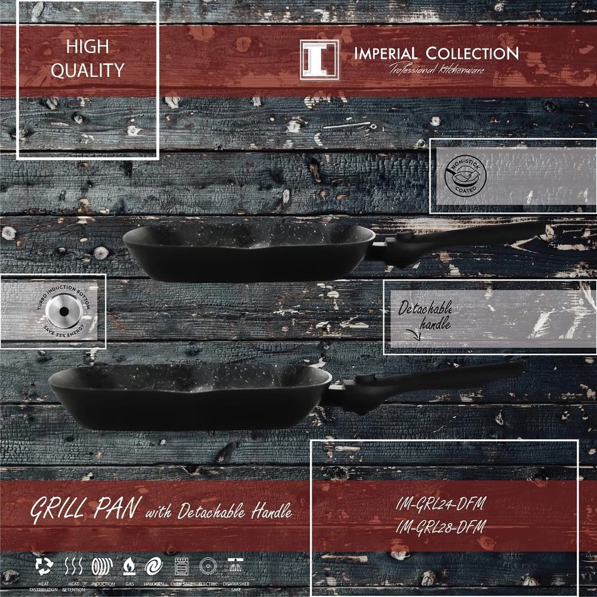 La Imperial Collection est une ligne professionnelle d’ustensiles de cuisine, avec cette poêle à griller vous cuisinez comme un vrai chef étoilé. La casserole peut être utilisée sur presque toutes les sources de chaleur; plaques à induction, gaz, céramiques, électriques, radiantes, pour ne jamais être confronté à des surprises en tant que chef. La lèchefrite a un revêtement en marbre de haute qualité avec un revêtement antiadhésif en pierre noire et des poignées amovibles au toucher soft qui économisent de l’espace dans votre cuisine.