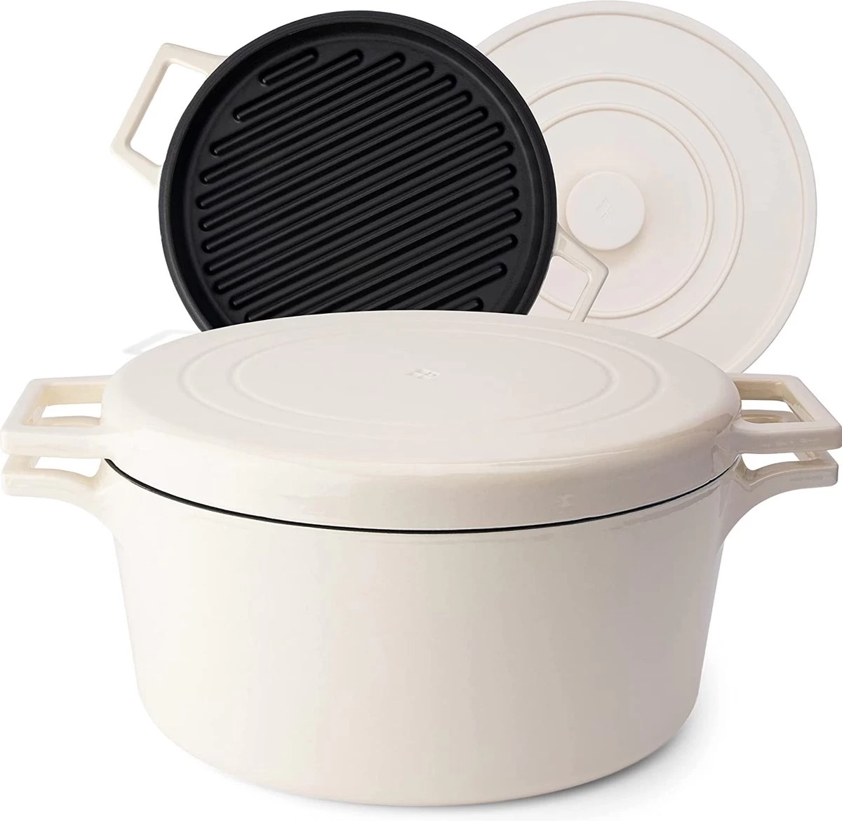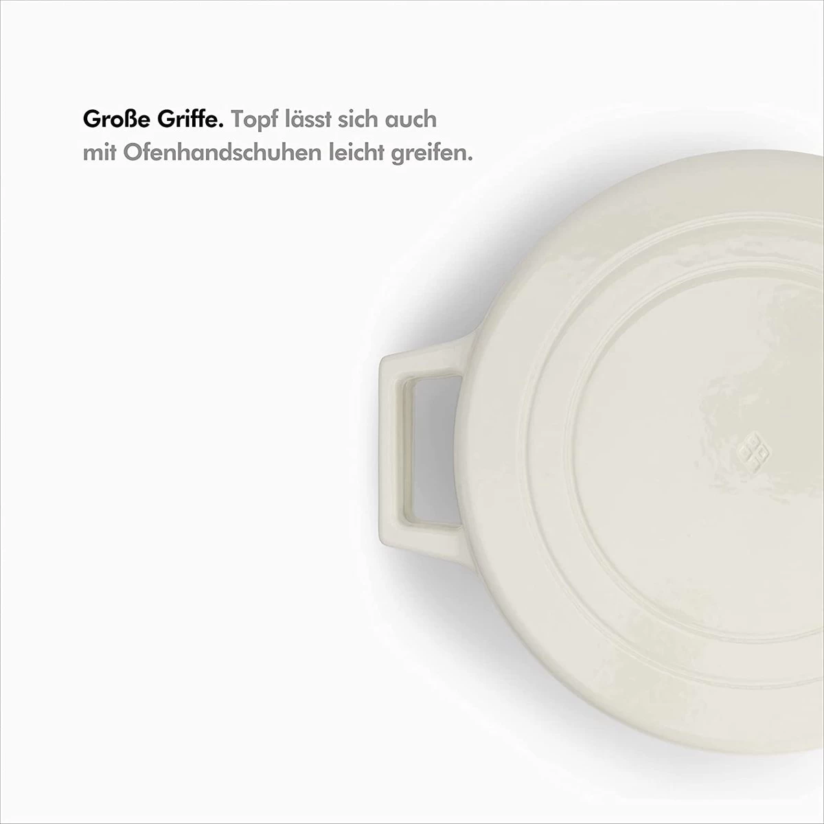 - Contenu de la livraison : plat à rôtir en fonte émaillée diamètre 26 cm, hauteur 12,2 cm, couvercle grill + couvercle en silicone. Couleur : blanc crème. Livré dans un emballage de haute qualité et sans plastique.