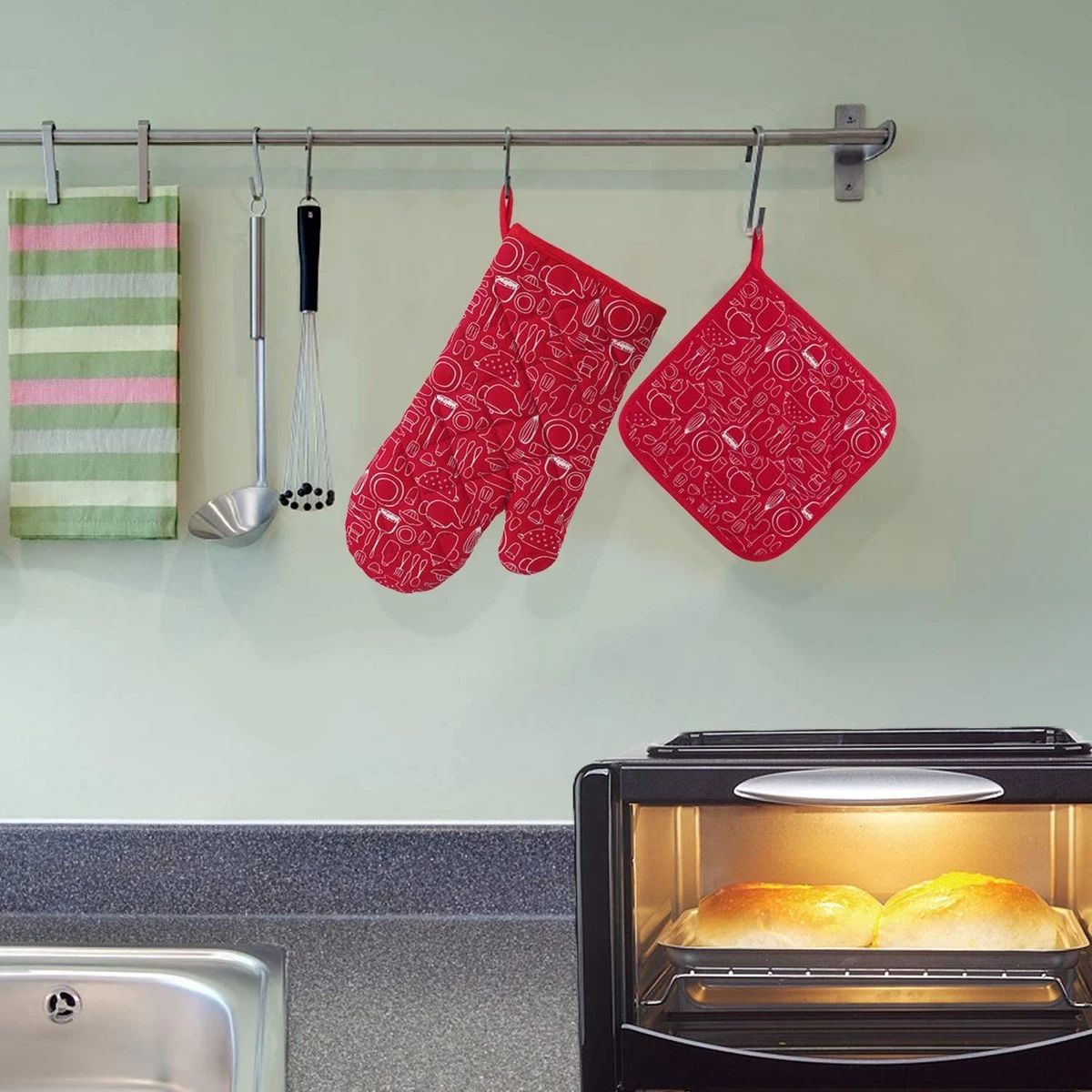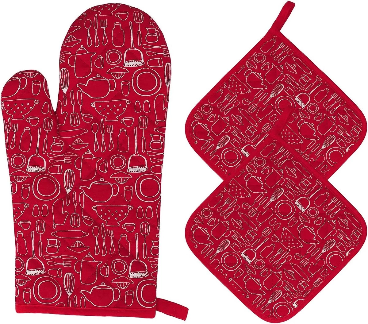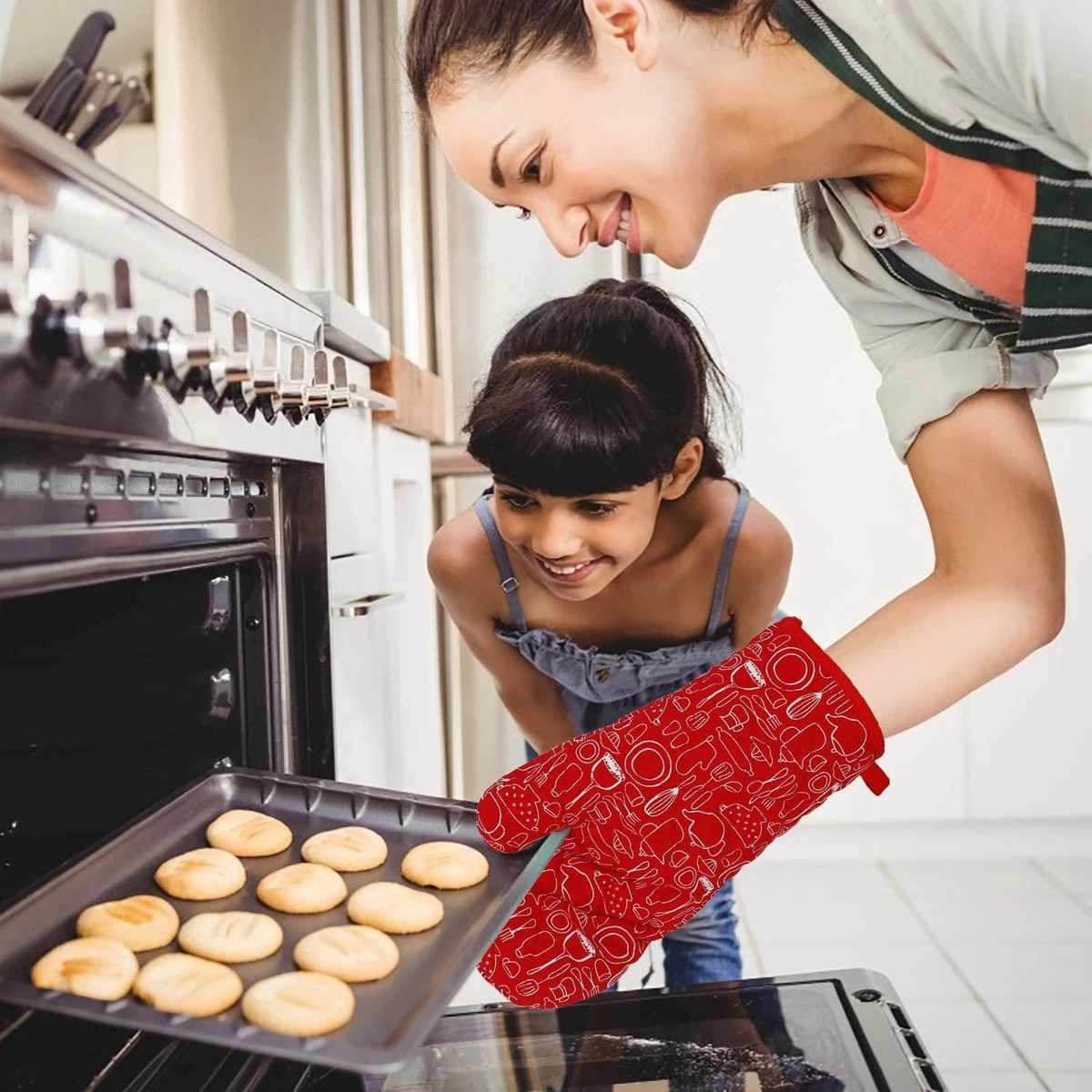 - COTON ÉPAIS CONFORTABLE – L’ensemble de gants de cuisine résistant à la chaleur est en coton lavable et est flexible et confortable à utiliser avec une doublure en coton doux. Imprimé avec un joli bâton blanc de vaisselle et d’ustensiles de cuisine, ajoutez une atmosphère amusante à votre cuisine.
