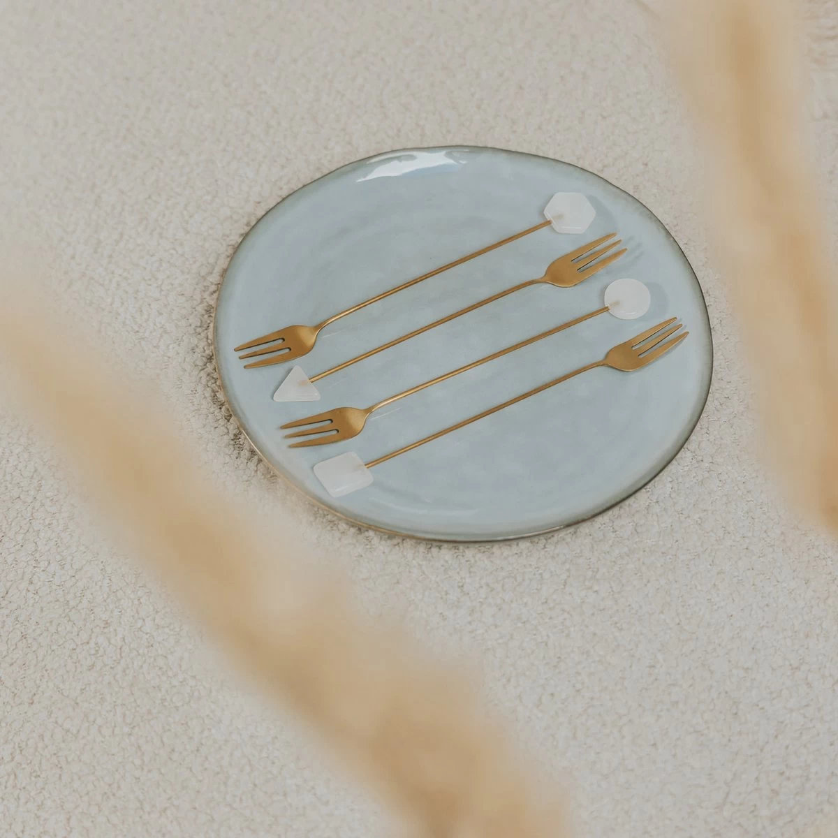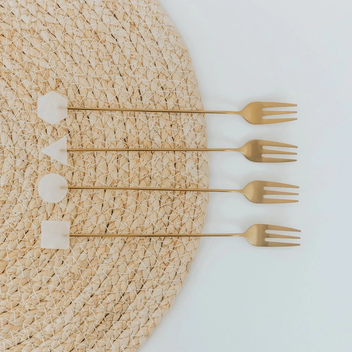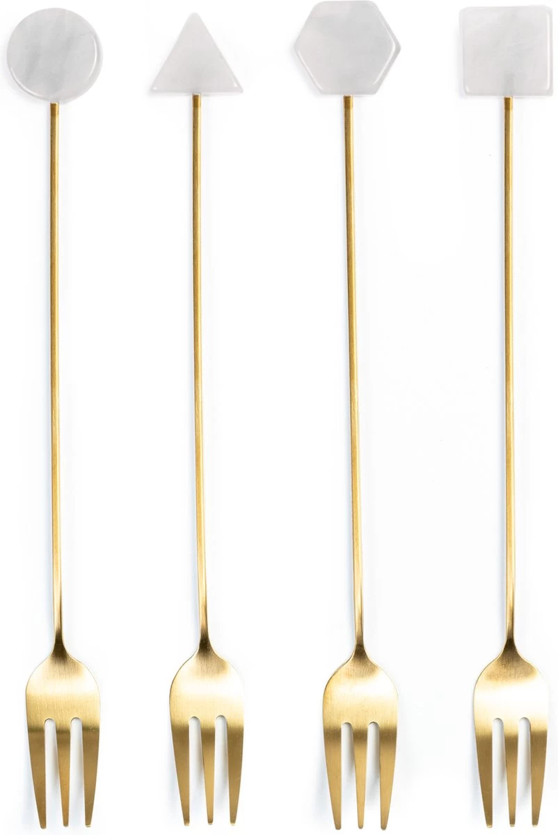 Cet ensemble se compose de 4 fourchettes à pâtisserie en 4 motifs, donc 1 pièce de chaque motif. Les plaques aspect marbre en haut ont les formes suivantes :