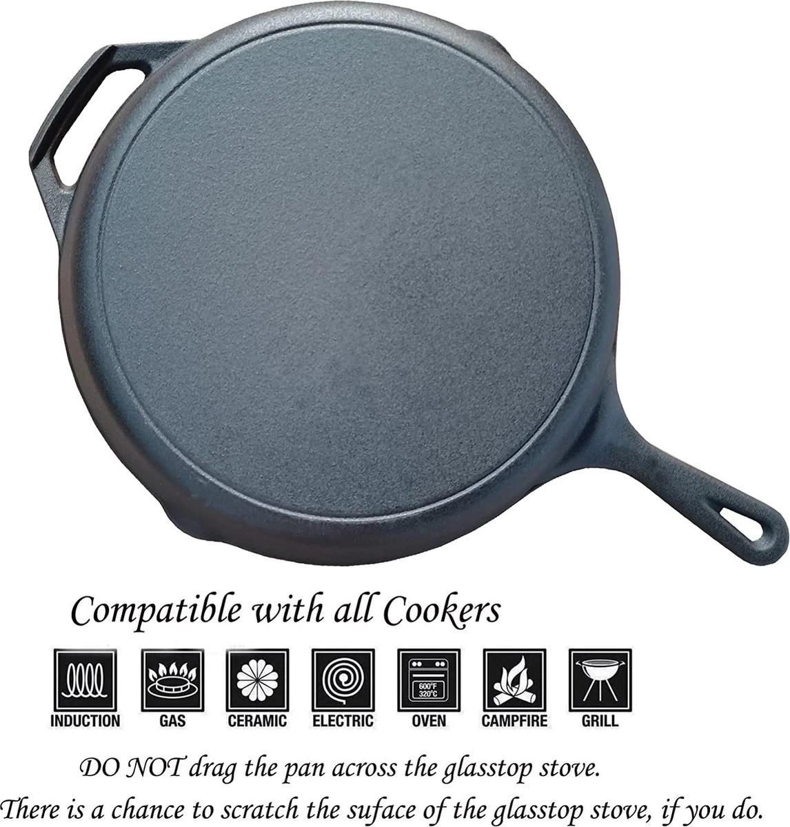 Poêle En Fonte De 12 Pouces Avec Revêtement En émail Noir Mat – Supports En Silicone Résistant à La Chaleur Inclus. Idéal Pour Une Utilisation Intérieure Et Extérieure, Passe Au Four.