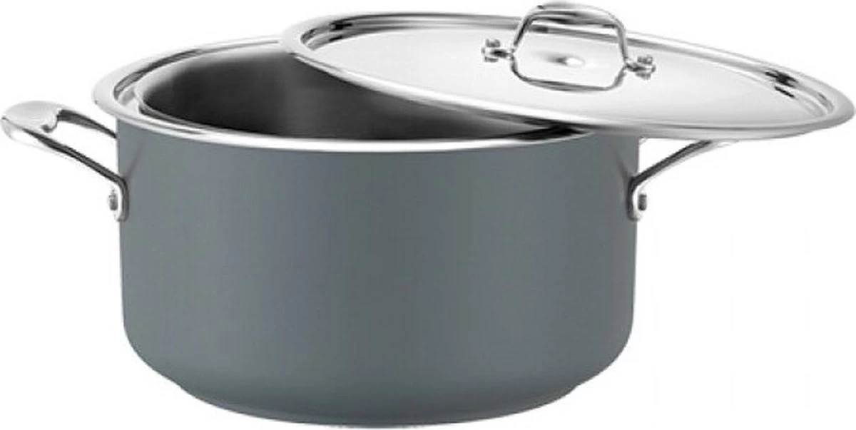 Complet avec pot intérieur, anneau de serrage et couvercle, équipé de poignées ergonomiques en acier inoxydable moulé et d’un couvercle spécial pour un support sur la poignée latérale, avec fond sandwich encapsulé
