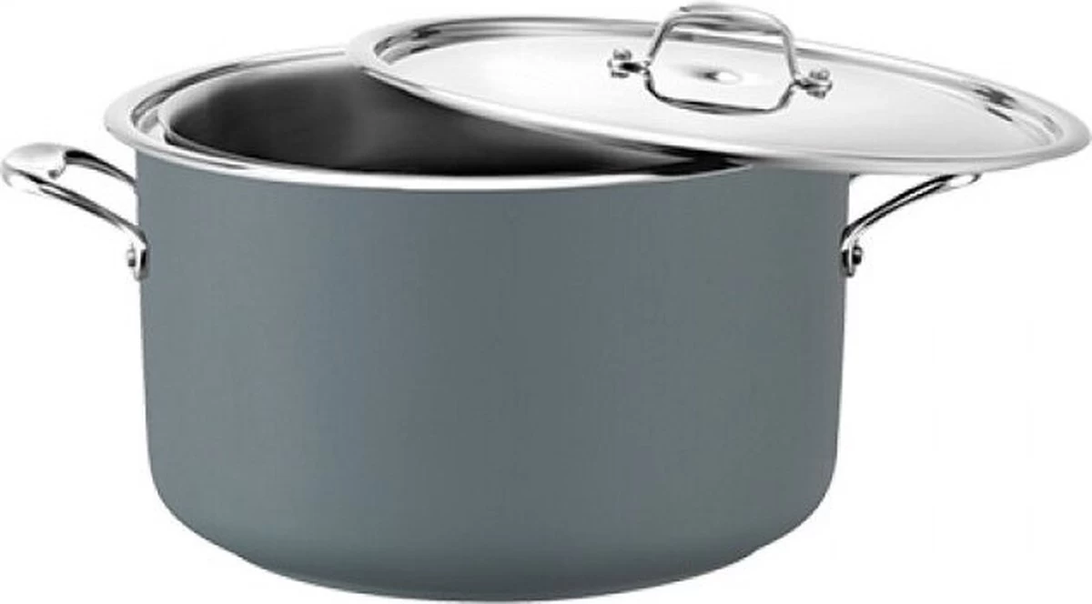 Complet avec pot intérieur, anneau de serrage et couvercle, équipé de poignées ergonomiques en acier inoxydable moulé et d’un couvercle spécial pour un support sur la poignée latérale, avec fond sandwich encapsulé