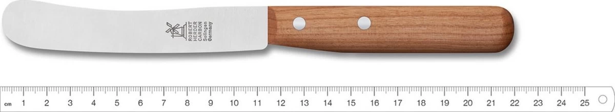 Né de la tradition rurale allemande, ce couteau est livré avec sa forme de lame spéciale. Ce couteau est fabriqué exactement de la même manière depuis 140 ans. Ce vieux couteau de table allemand est large pour que vous puissiez le couper en douceur et tranchant afin de pouvoir également couper des saucisses parfaitement dures avec. Convient également parfaitement pour étaler le beurre uniformément sur un sandwich. Ce couteau de petit-déjeuner a un beau manche en bois agréablement tenu à la main. Un polyvalent pointu pour la cuisine et la table. En 2013, ce magnifique couteau a reçu le «prix de la marque des normes allemandes».