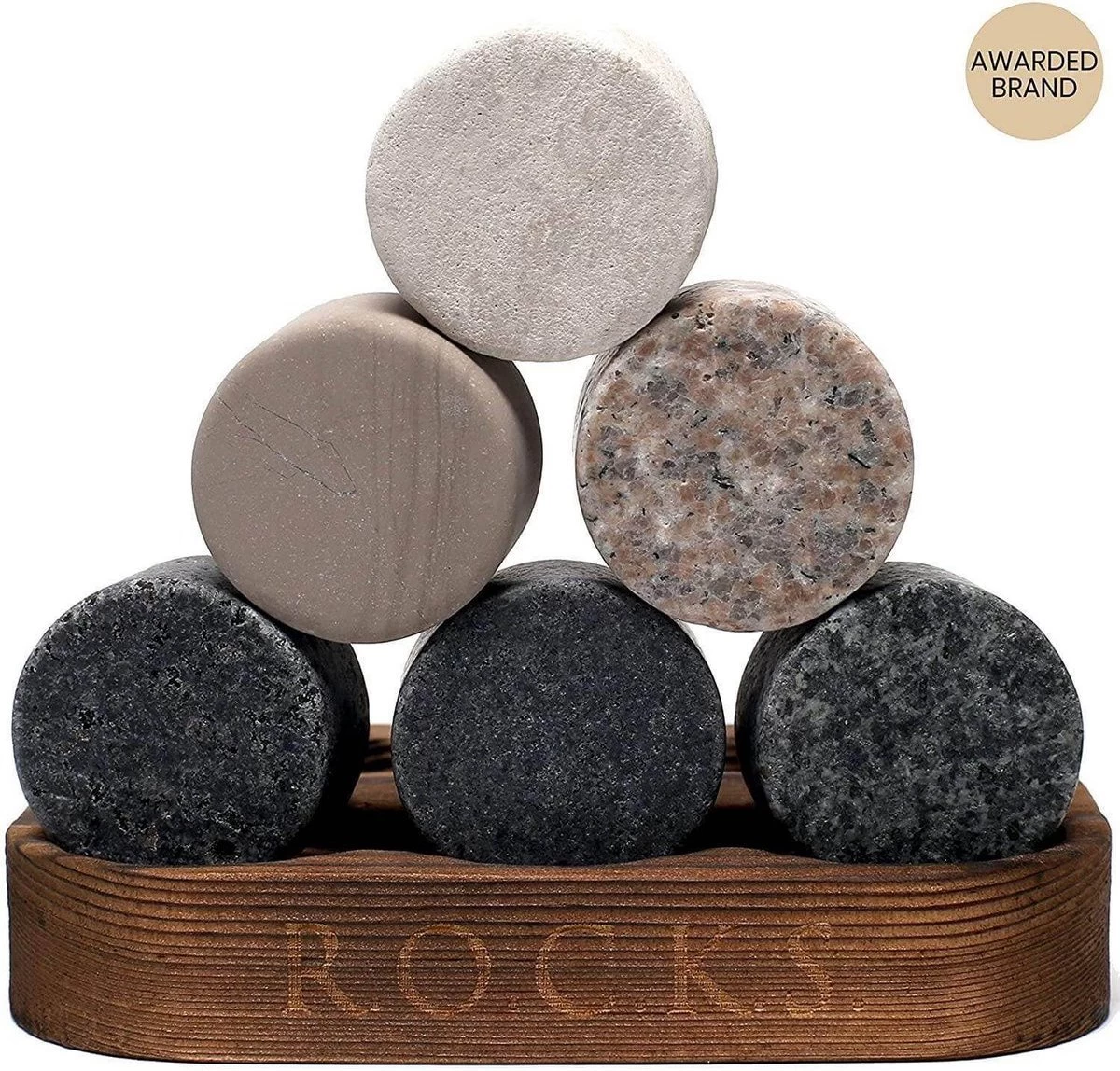 Nos 6 pierres de refroidissement en granit se détachent magnifiquement dans un support en bois dur qui peut également être utilisé pour les stocker au congélateur. C’est élégant et pratique !