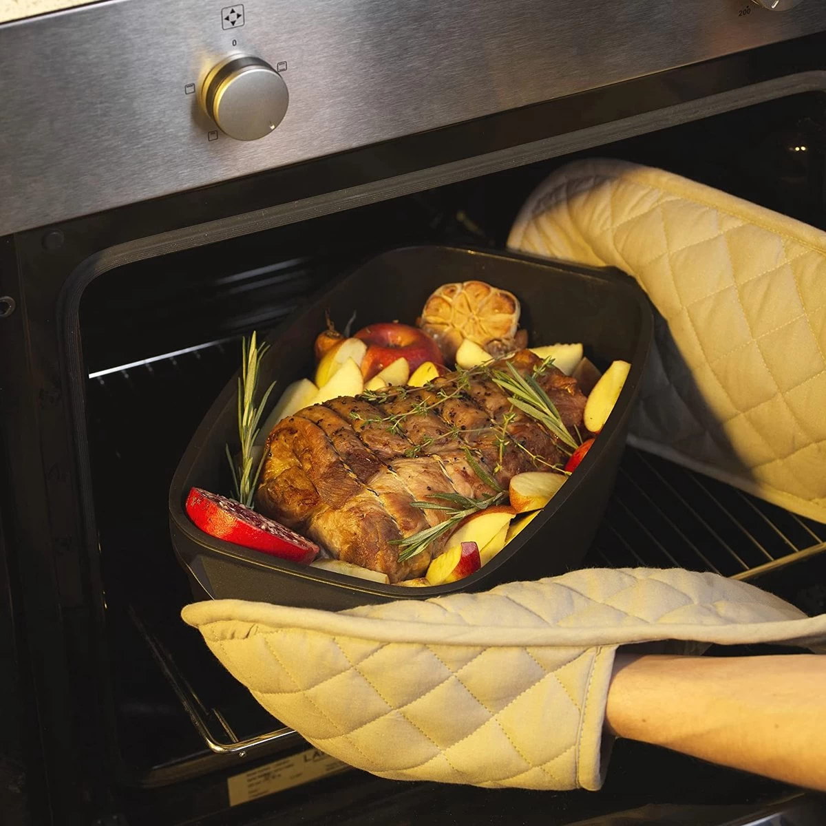 L’ensemble peut être utilisé comme rôtissoire pour garder votre viande humide, ou seul pour plus de flexibilité de cuisson.
