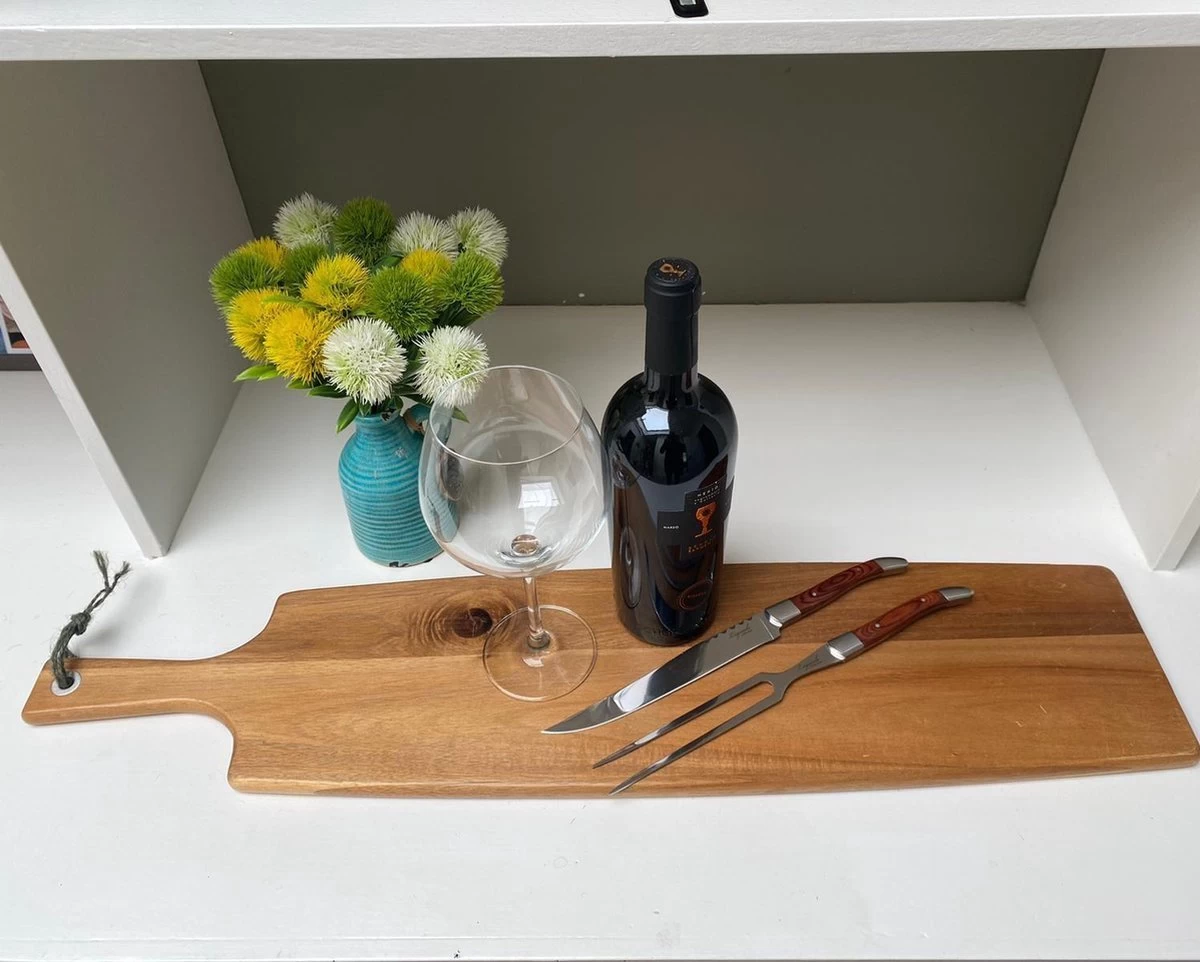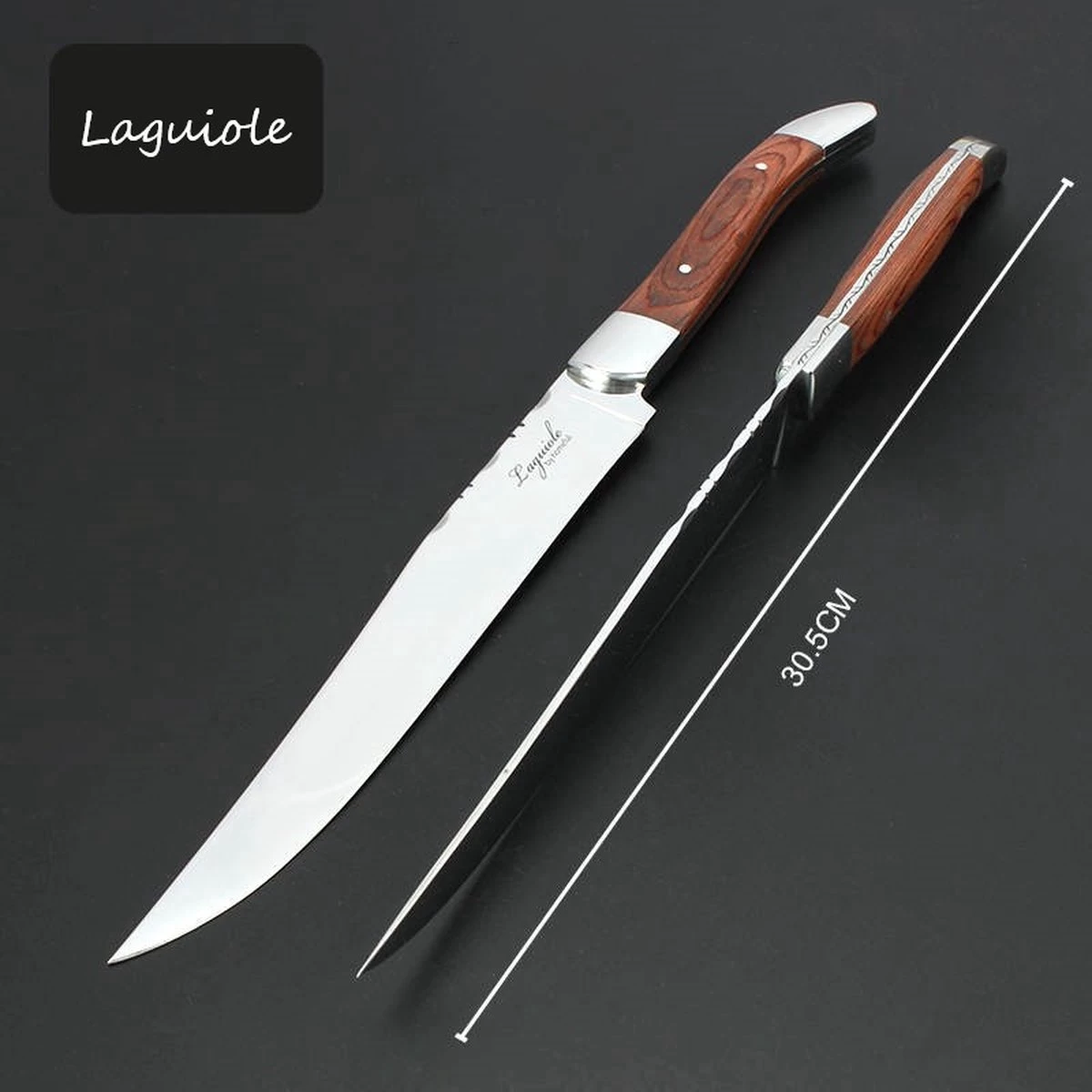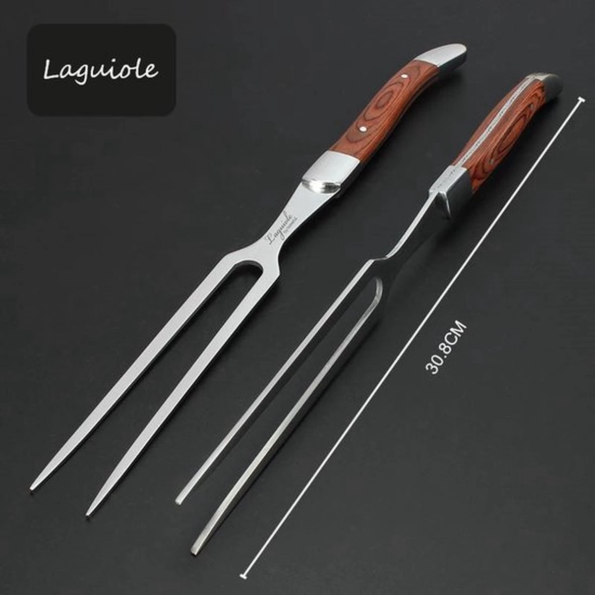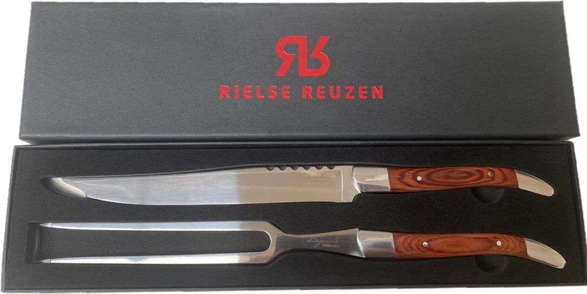 La poignée élégante tient confortablement dans la main, est en bois et donne à l’ensemble un aspect luxueux. La lame et la fourchette sont en acier inoxydable et l’ensemble est livré dans un bel emballage.
