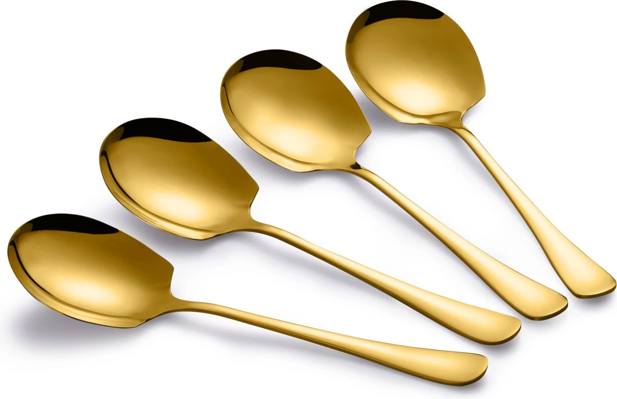 Les cuillères sont fabriquées en acier inoxydable de qualité alimentaire. Cela garantit qu’ils durent des années et qu’ils n’ont pas d’arrière-goût métallique. Cet ensemble se compose de 4 cuillères de service dorées qui peuvent être facilement nettoyées dans votre lave-vaisselle après utilisation.