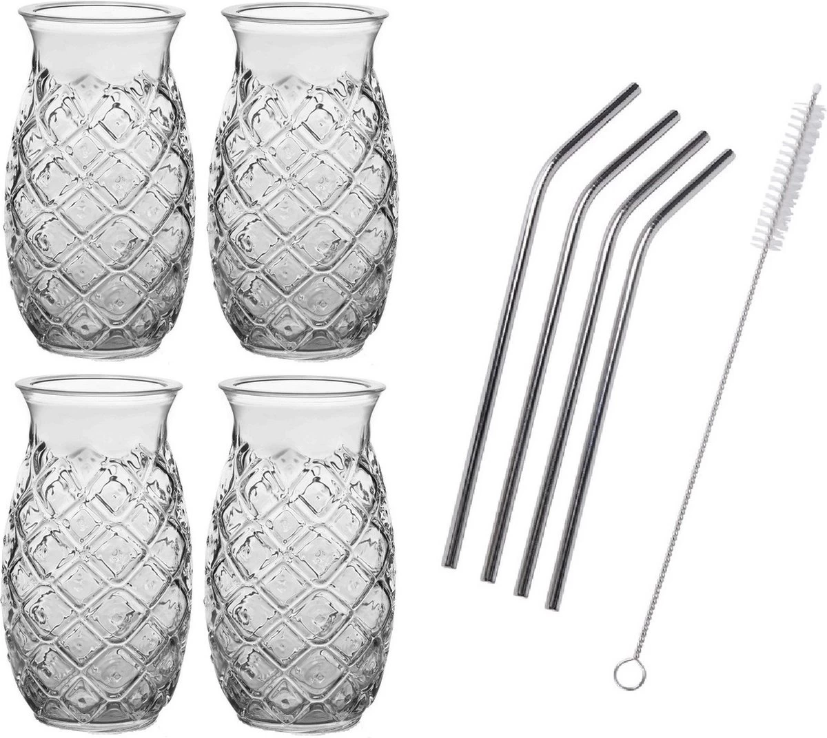 Set De 4x Verres à Cocktail Transparents 505 Ml Pina Colada – Y Compris 4x Pailles Réutilisables En Acier Inoxydable