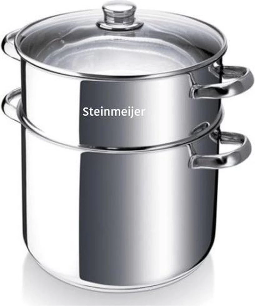 Cette poêle pratique convient à la cuisson à induction, électrique, halogène, au gaz et en céramique. De plus, vous pouvez simplement mettre la machine à couscous au lave-vaisselle lorsque vous avez terminé. La façon la plus saine de préparer les aliments est la cuisson à la vapeur. Cela préserve de précieuses vitamines et minéraux et la couleur des légumes reste comme il se doit. Les légumes restent mous mais al dente, le poisson ne se désagrège pas. Rien ne sèche et rien ne brûle dans la vapeur. Aussi, la cuisson à la vapeur du riz cuit ou le chauffage à la vapeur gardent aux plats leur eigen saveur intense. L’excellent transfert de chaleur de la vapeur d’eau garantit une cuisson uniforme des ingrédients à l’intérieur. Le cuiseur vapeur Steinmeijer est en acier inoxydable 18/10. La casserole inférieure a un fond sandwich encapsulé pour une conduction thermique rapide. Le couvercle en verre pratique donne une bonne vue du processus de cuisson à la vapeur pendant la préparation. Les gouttelettes gardent la vue claire pendant la cuisson à la vapeur.