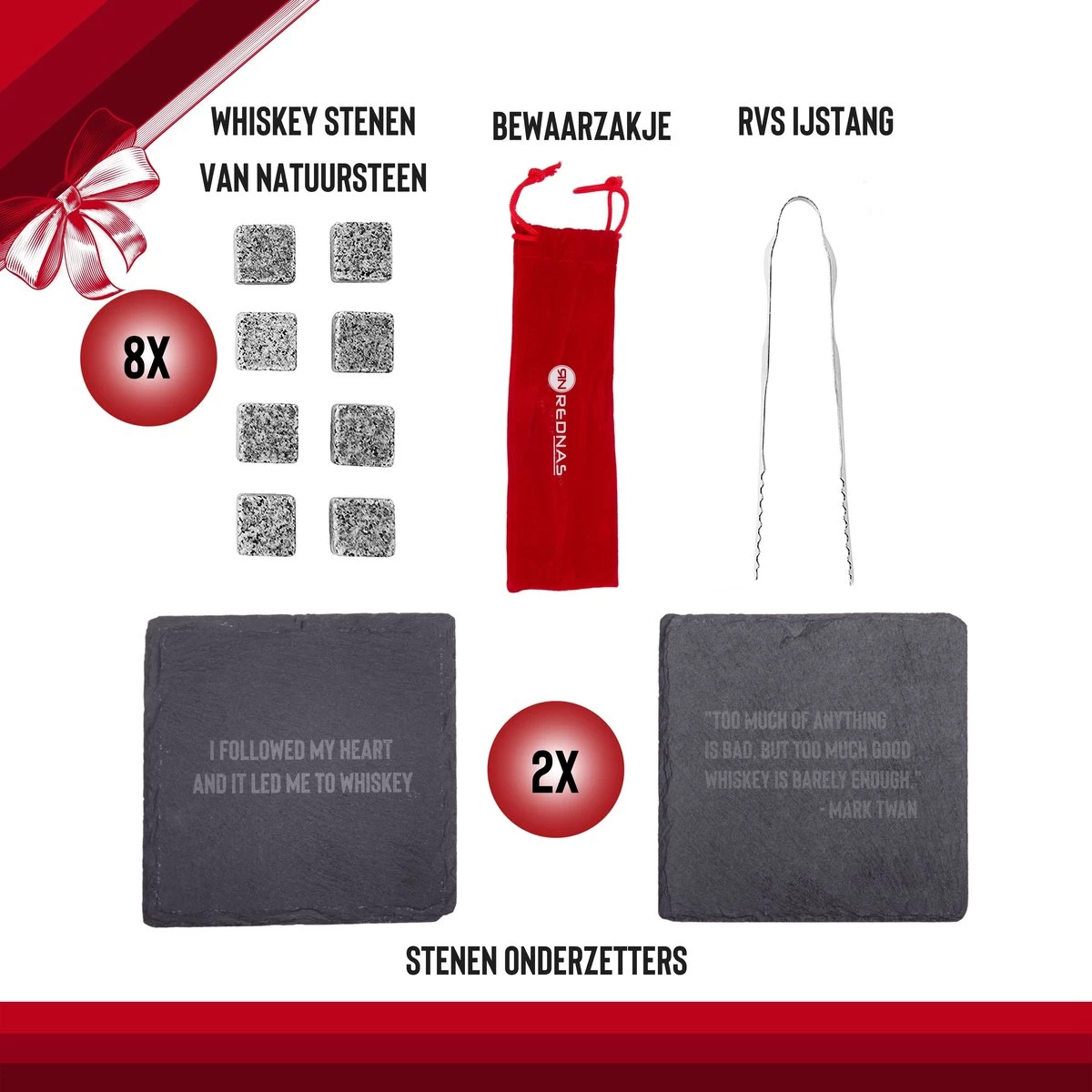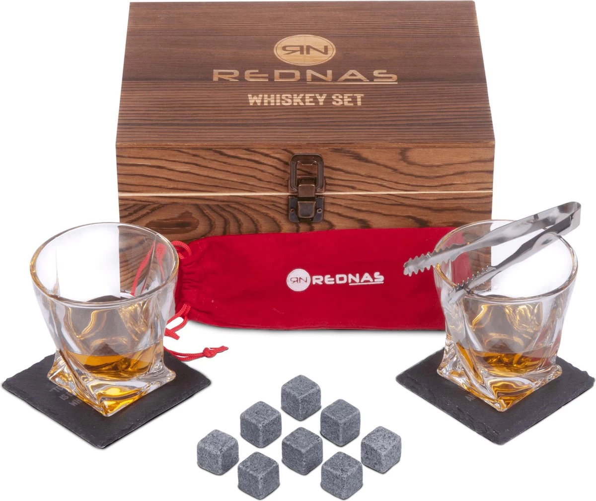 - Y compris le sac de rangement en velours : vous pouvez ranger les pierres à whisky avec style dans le sac de rangement en velours Rednas fourni.