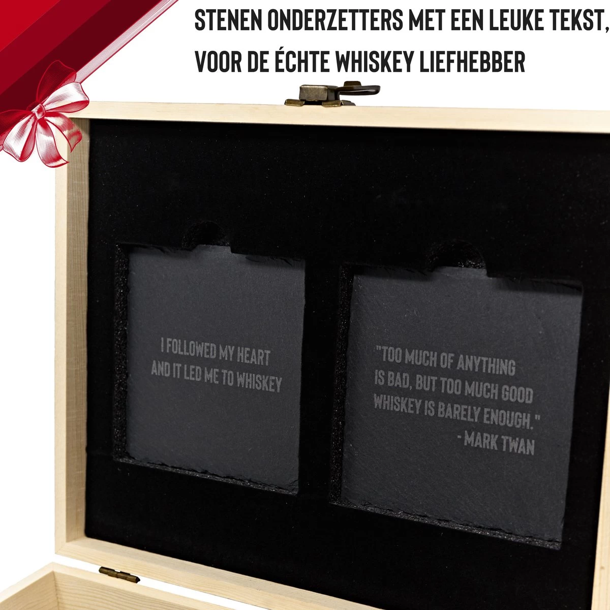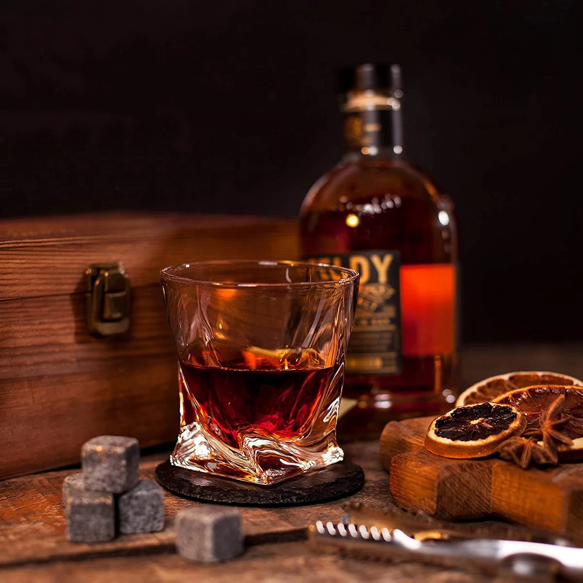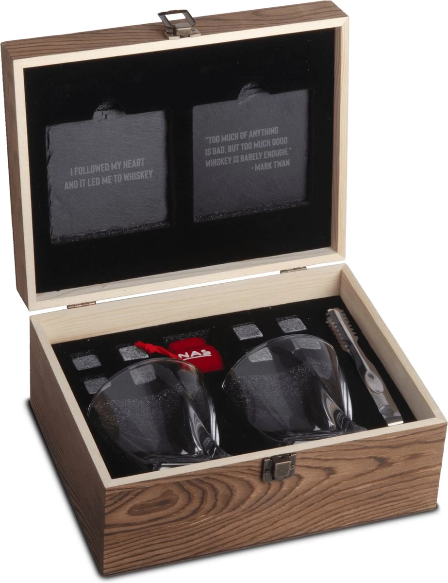 Contenu: 2 verres à whisky, 8 pierres à whisky + sac de rangement, 2 sous-verres, pince à glace, boîte de rangement luxe
