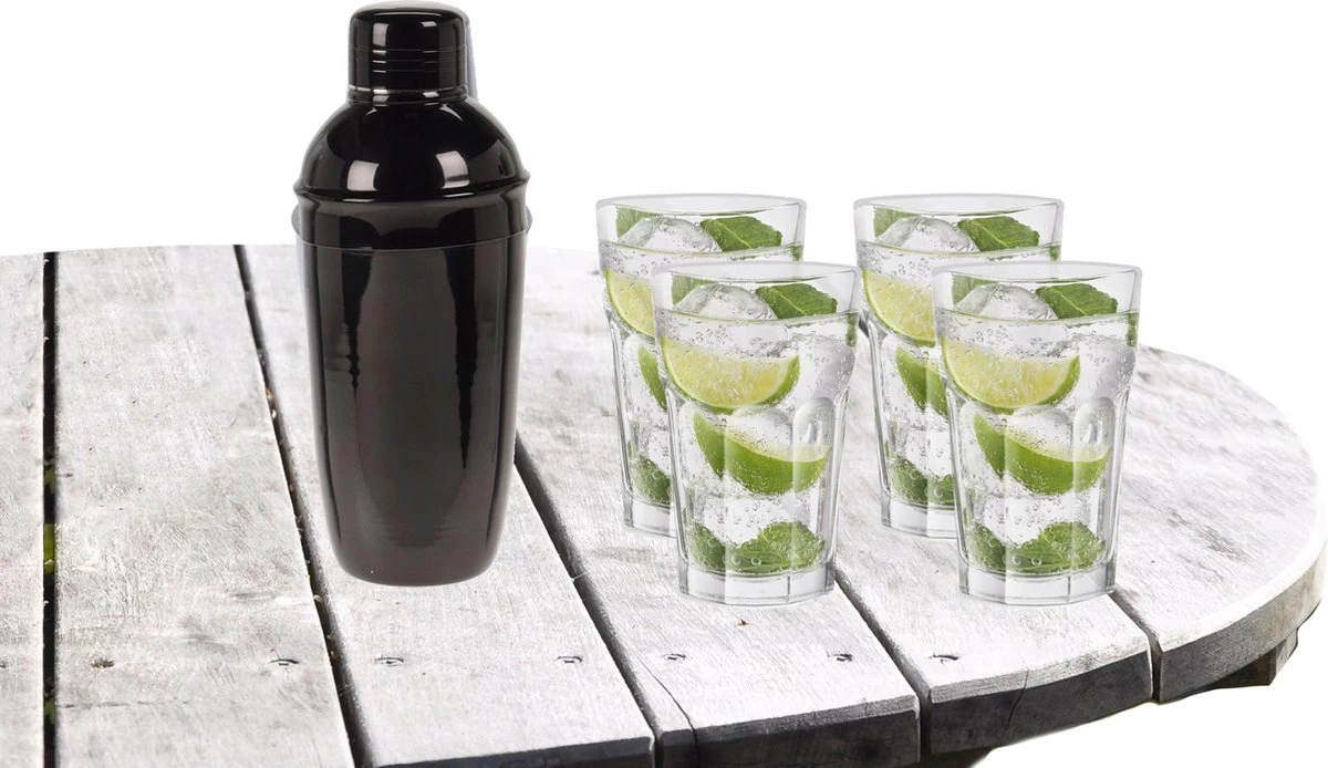 Shaker à cocktail en acier inoxydable noir 500 ML serti de 4 pièces Verres à Verres à cocktail style Mojito transparent 410 ml. Diamètre 9 cm et passe au lave-vaisselle. Faites vos eigen cocktails à la maison.