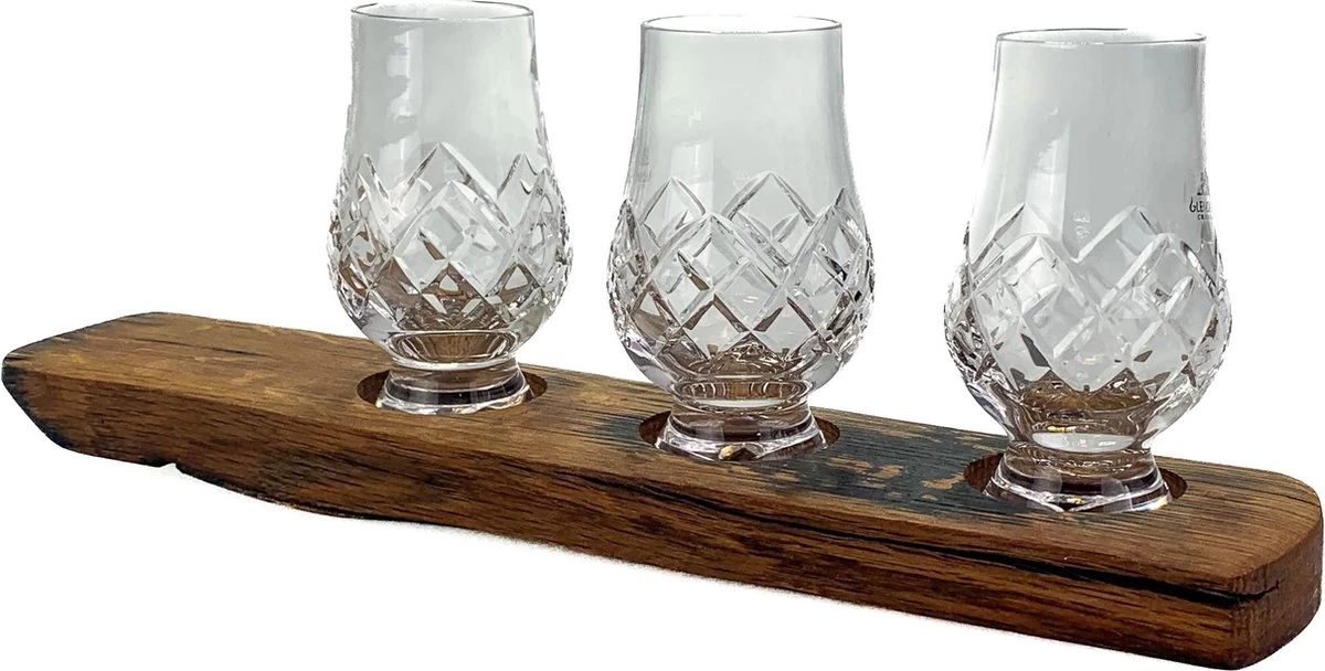 Support Vintage Et 3 Verres à Whisky Glencairn Série CUT – Support Fabriqué En Ecosse à Partir D’anciens Fûts De Whisky