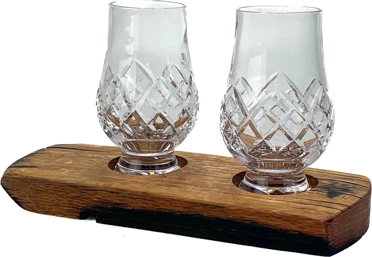 Un assemblage vraiment unique. Les supports sont fabriqués en Ecosse à partir d’anciens fûts de whisky par la société Darach. Chaque support peut donc être légèrement différent de celui de la photo. Sont également fournis 2 verres à whisky de la série CUT de la marque mondialement connue Glencairn.