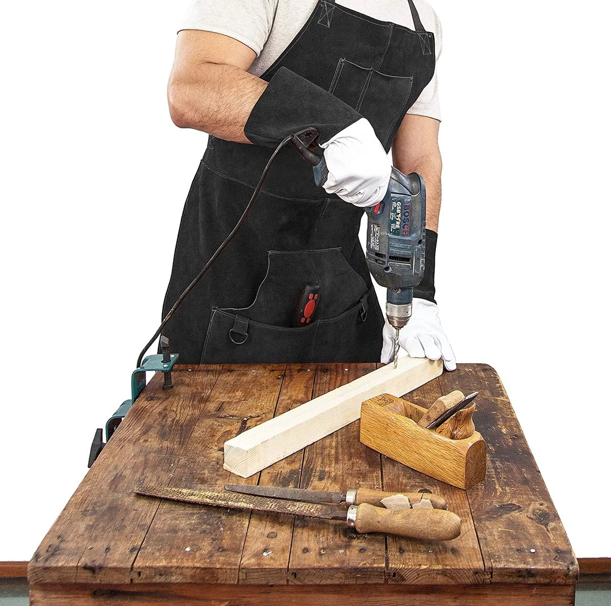 - Nous avons fabriqué notre tablier en cuir de vachette à haute résistance à la chaleur et aux flammes, de sorte qu’il ne reviendra jamais vous toucher avec une étincelle ou un couteau. Protection maximale de la poitrine aux genoux.