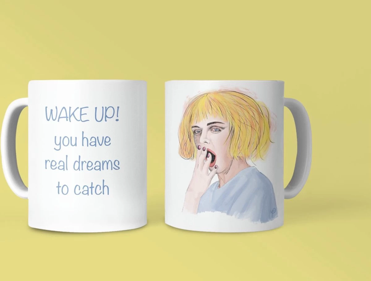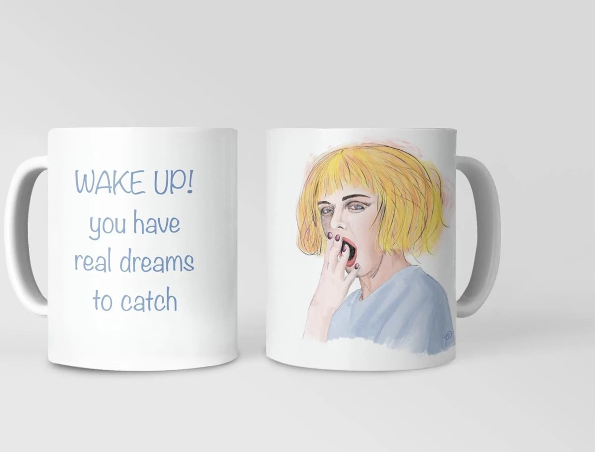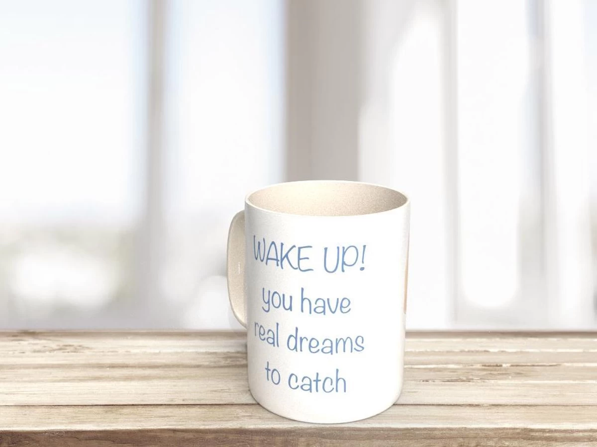 Ce pur talent artistique sur une tasse avec une belle œuvre d’art de quelqu’un qui se réveille d’un côté et le texte : « Réveillez-vous, vous avez de vrais rêves à attraper »