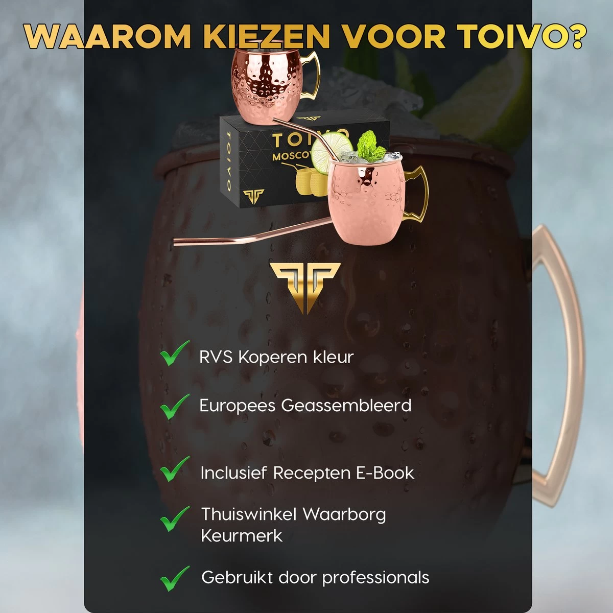 L’ensemble contient deux tasses TOIOV Moscow Mule, deux pailles en cuivre, un manuel TOIVO et un E-Book GRATUIT contenant de nombreuses recettes et astuces pour le cocktail parfait !