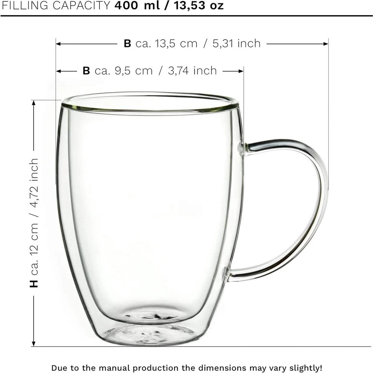 - Contenu de la livraison : 6 verres à thé ou à café à double paroi de 400 ml avec anse, en verre borosilicaté de haute qualité, qui gardent les boissons chaudes chaudes plus longtemps et les boissons froides froides plus longtemps. De plus, le verre à double paroi assure une température constante du verre extérieur à tout moment, de sorte que même les doigts brûlés appartiennent au passé.